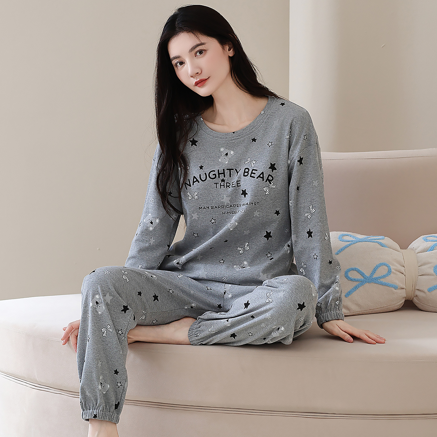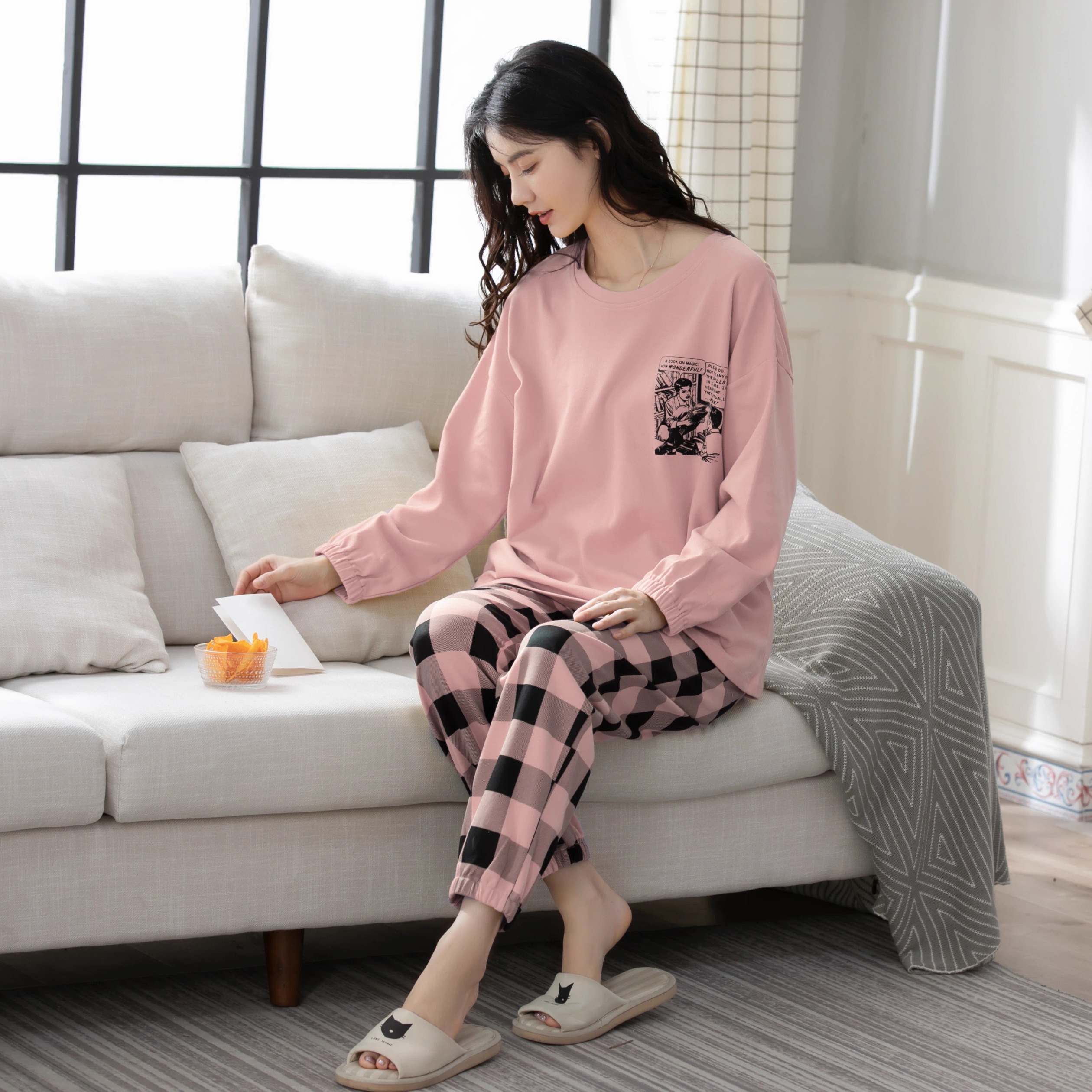 首页> 内衣> 100%纯棉加厚长袖睡衣女款2025新款春秋季外穿宽松圆领格子家居服