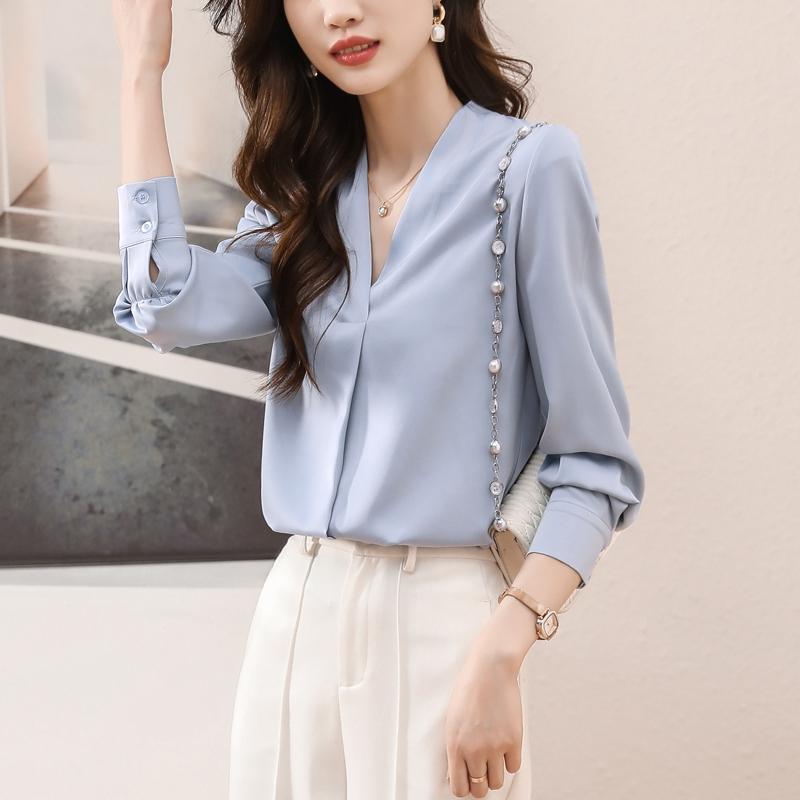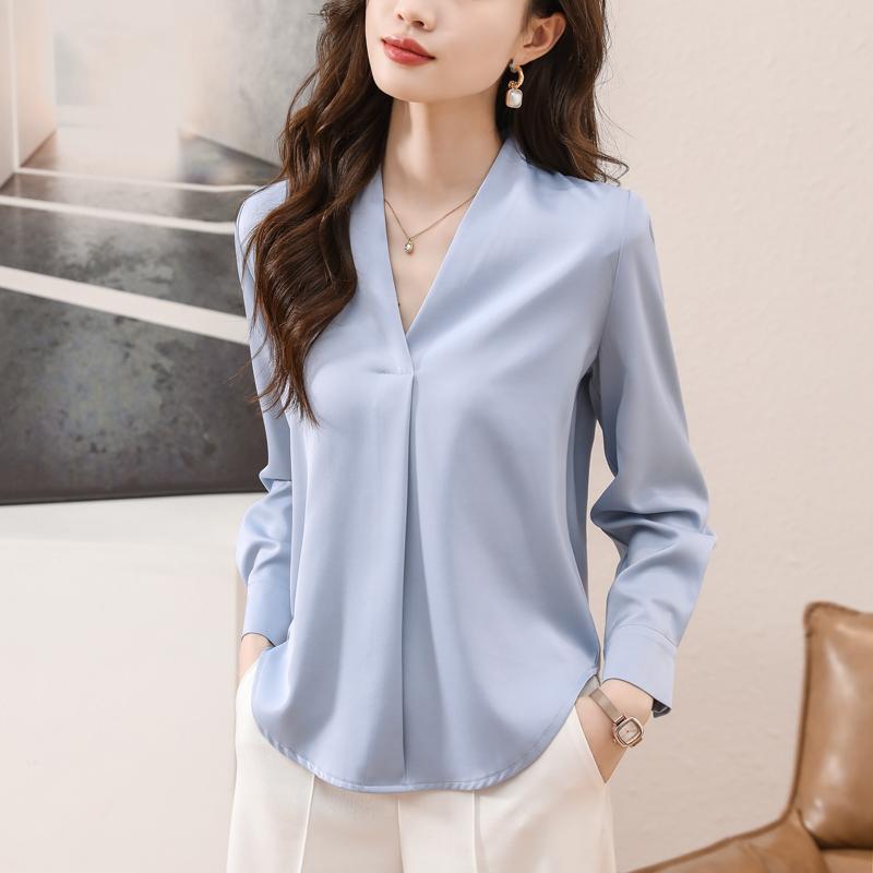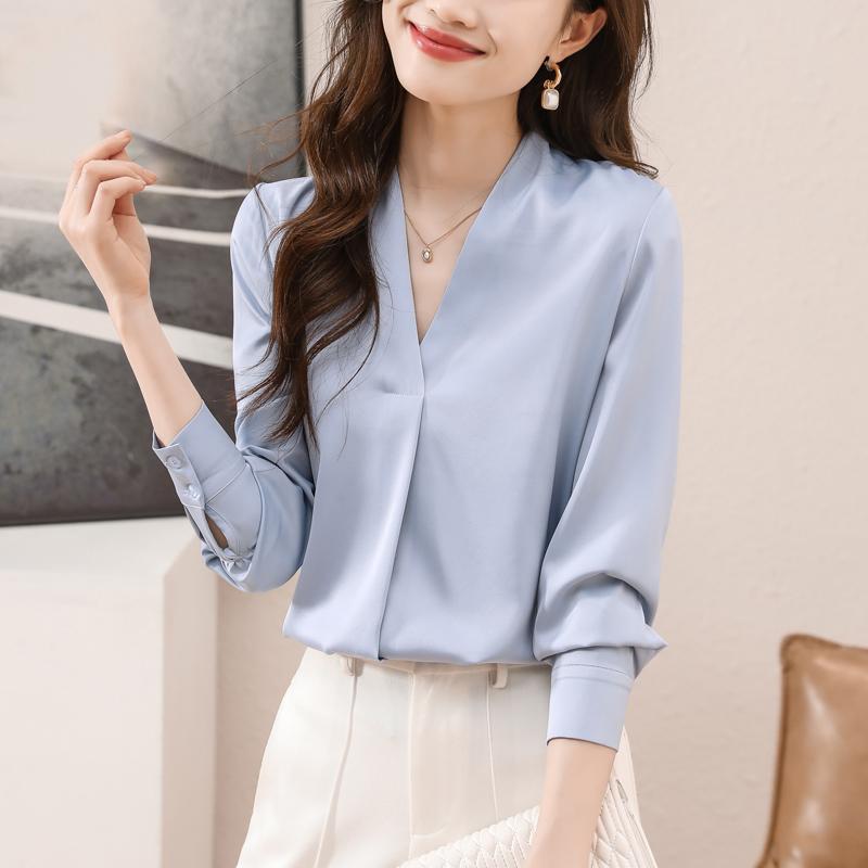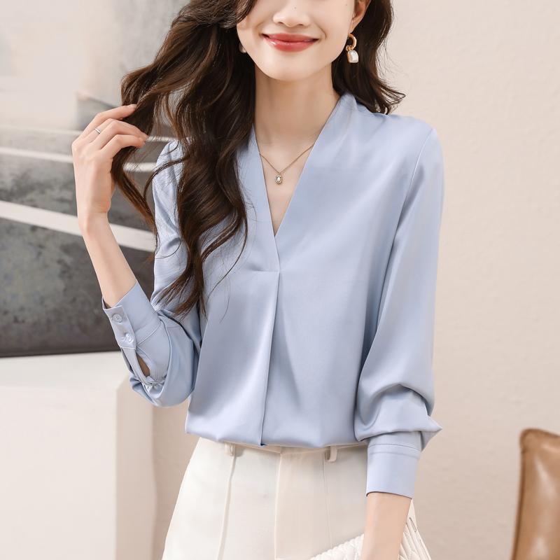 高档气质法式缎面衬衫女长袖春夏设计感小众职业V领衬衣百搭通勤
