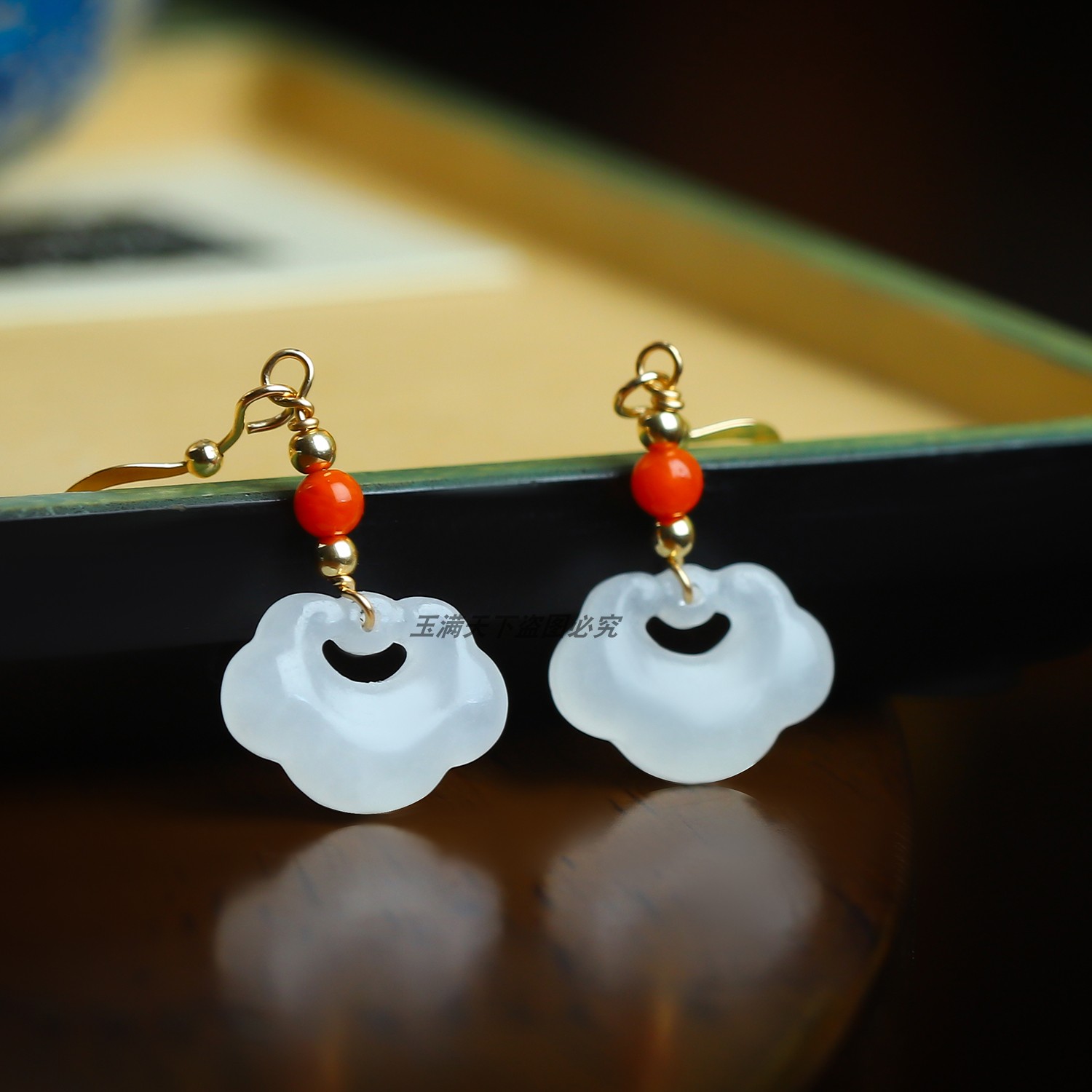 轻奢小众天然和田玉白玉平安扣如意锁耳环14K包金玉石耳坠