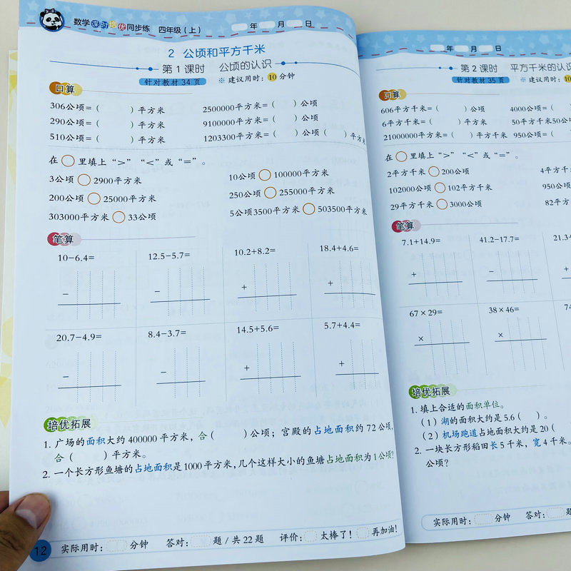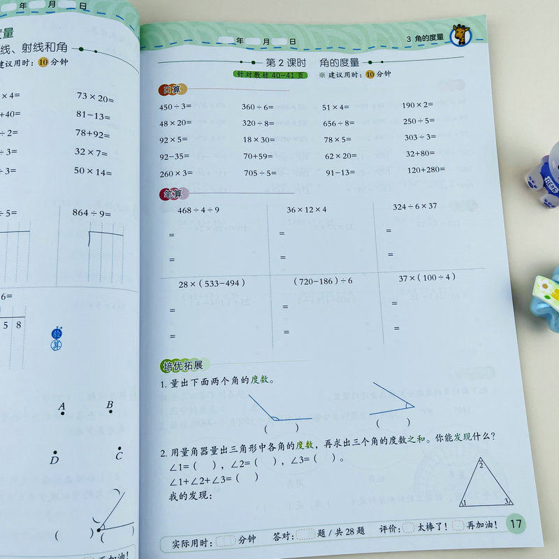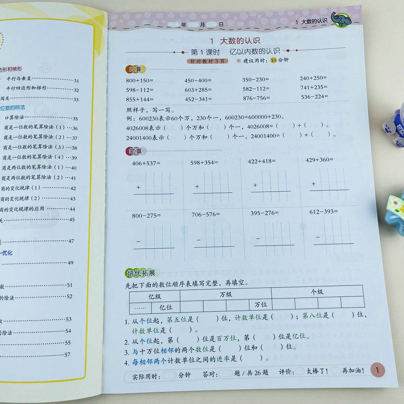 小学数学课时培优同步练习册四年级上册人教版基础训练培优拓展口算竖式脱式大数的认识三位数乘两位数除数是两位数的除法角的度量