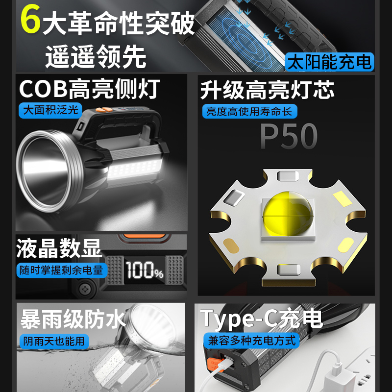 太阳能强光探照灯户外超亮充电式手电筒远射手提灯大容量超长续航