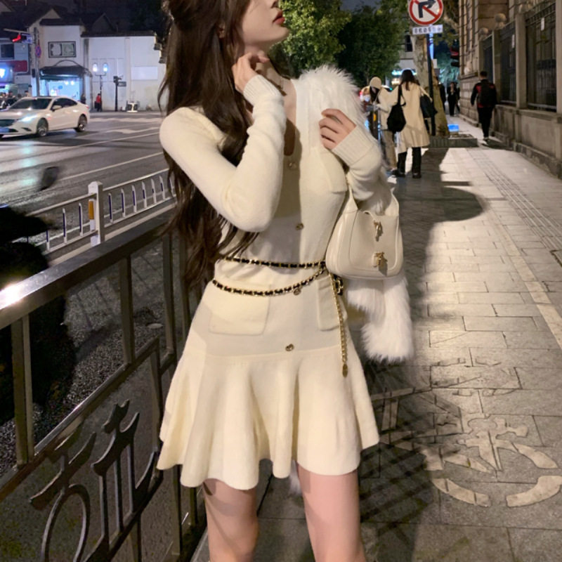 御姐设计感长袖2023秋冬女装纯欲针织连衣裙性感短款毛衣裙女潮