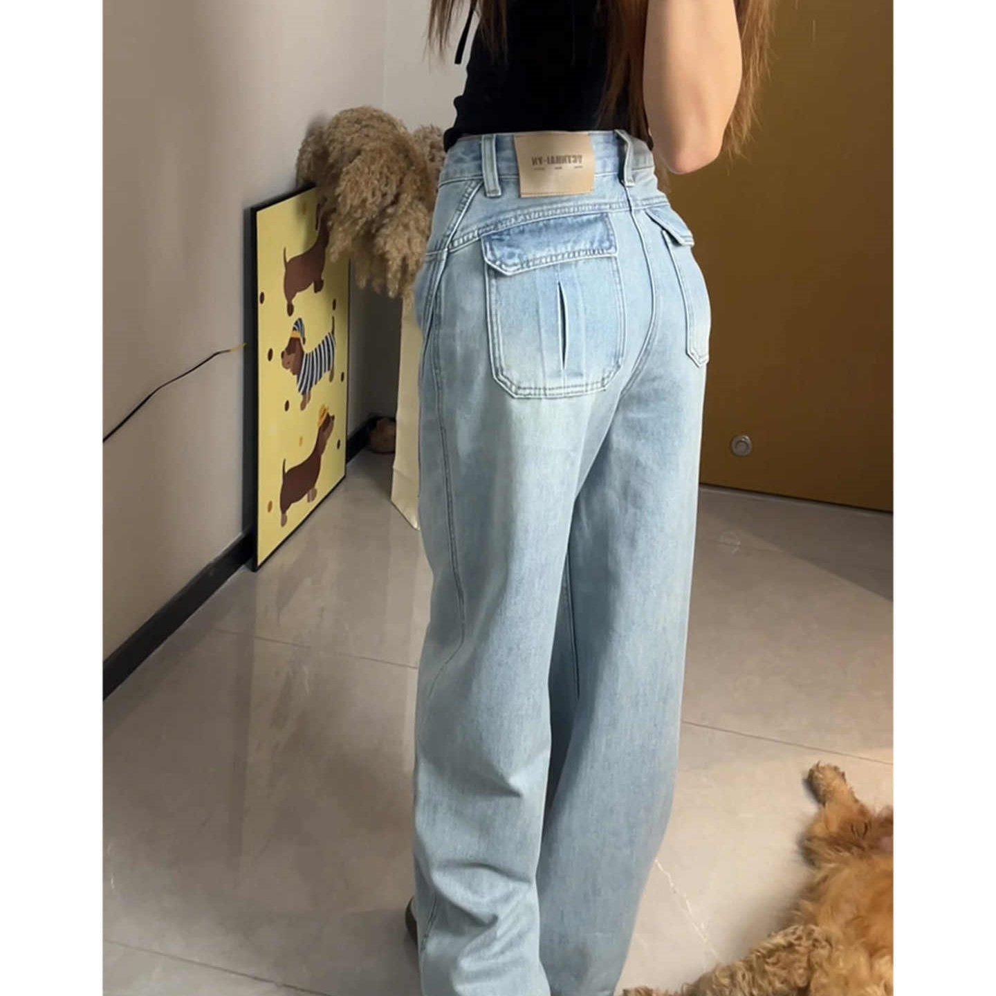 冰川蓝窄版弯刀牛仔裤女夏秋季2025年新款宽松显瘦直筒阔腿长裤子