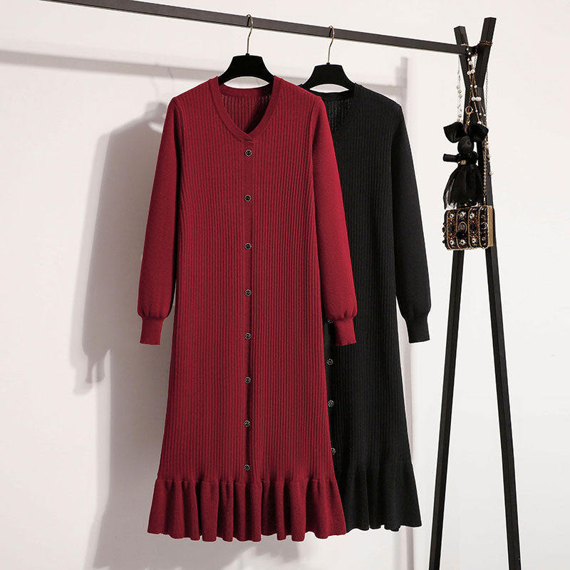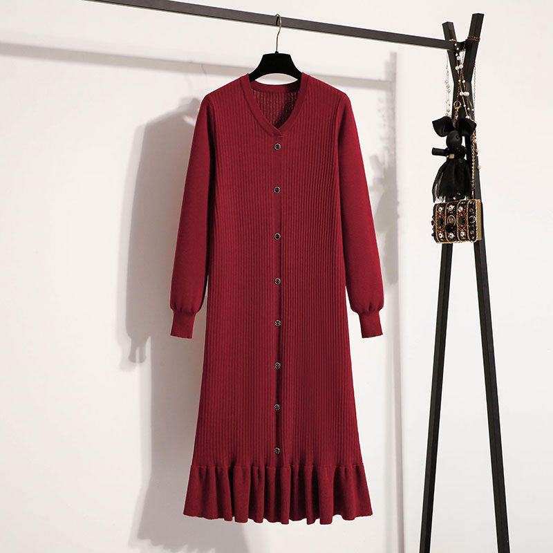 新年红色V领针织连衣裙2026新款冬季大码胖mm法式下摆荷叶边裙子