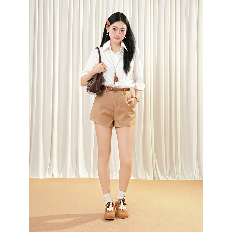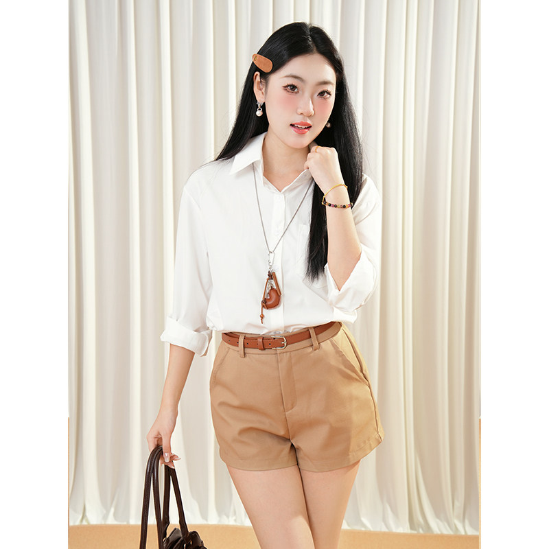 韩系高级白色v领衬衫+卡其色短裤两件套女夏季2025年通勤穿搭新款