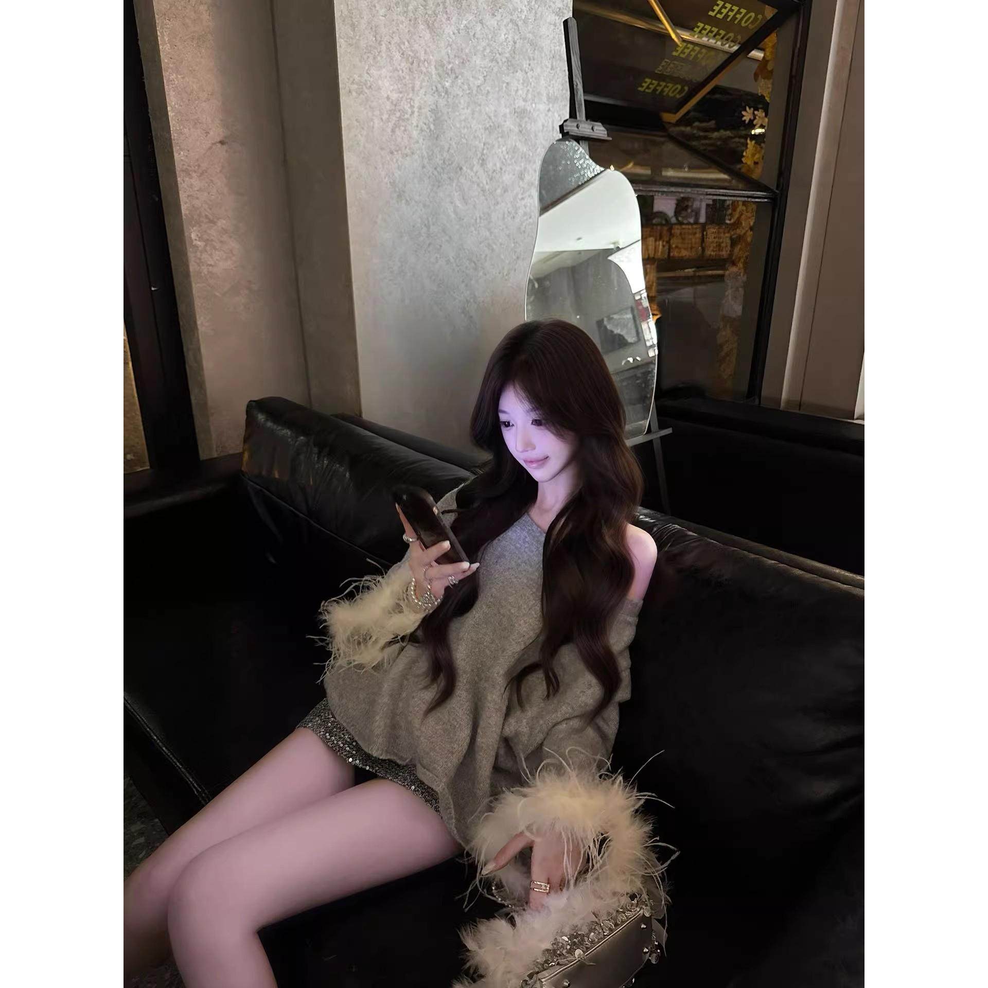 辣妹风灰色一字肩毛毛袖口针织衫上衣女2025秋冬新款宽松露肩毛衣