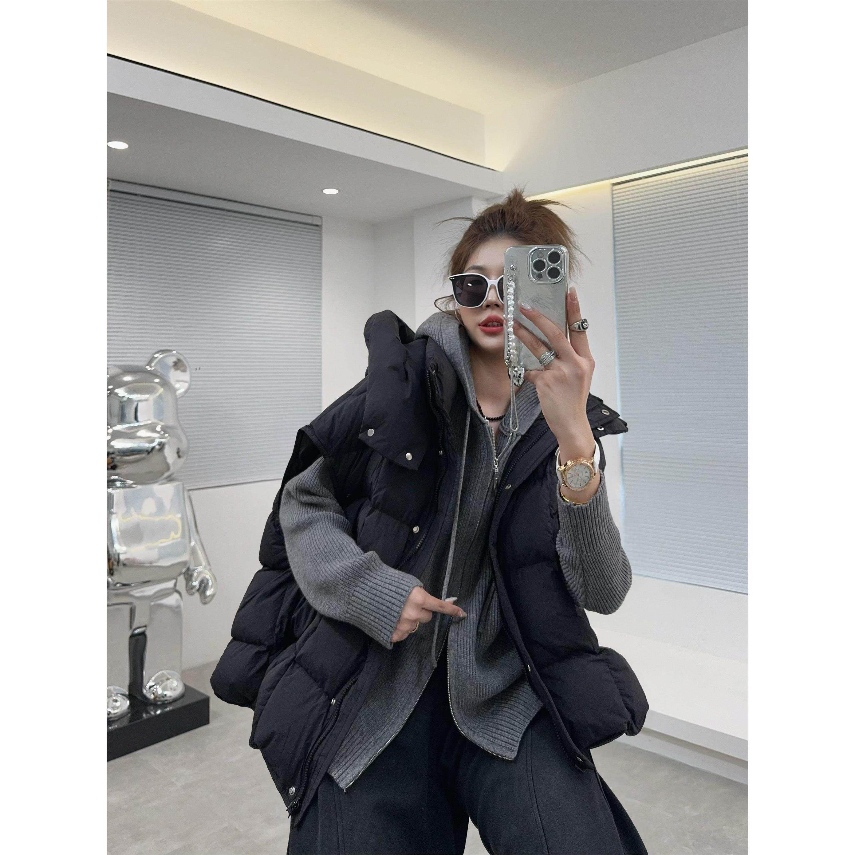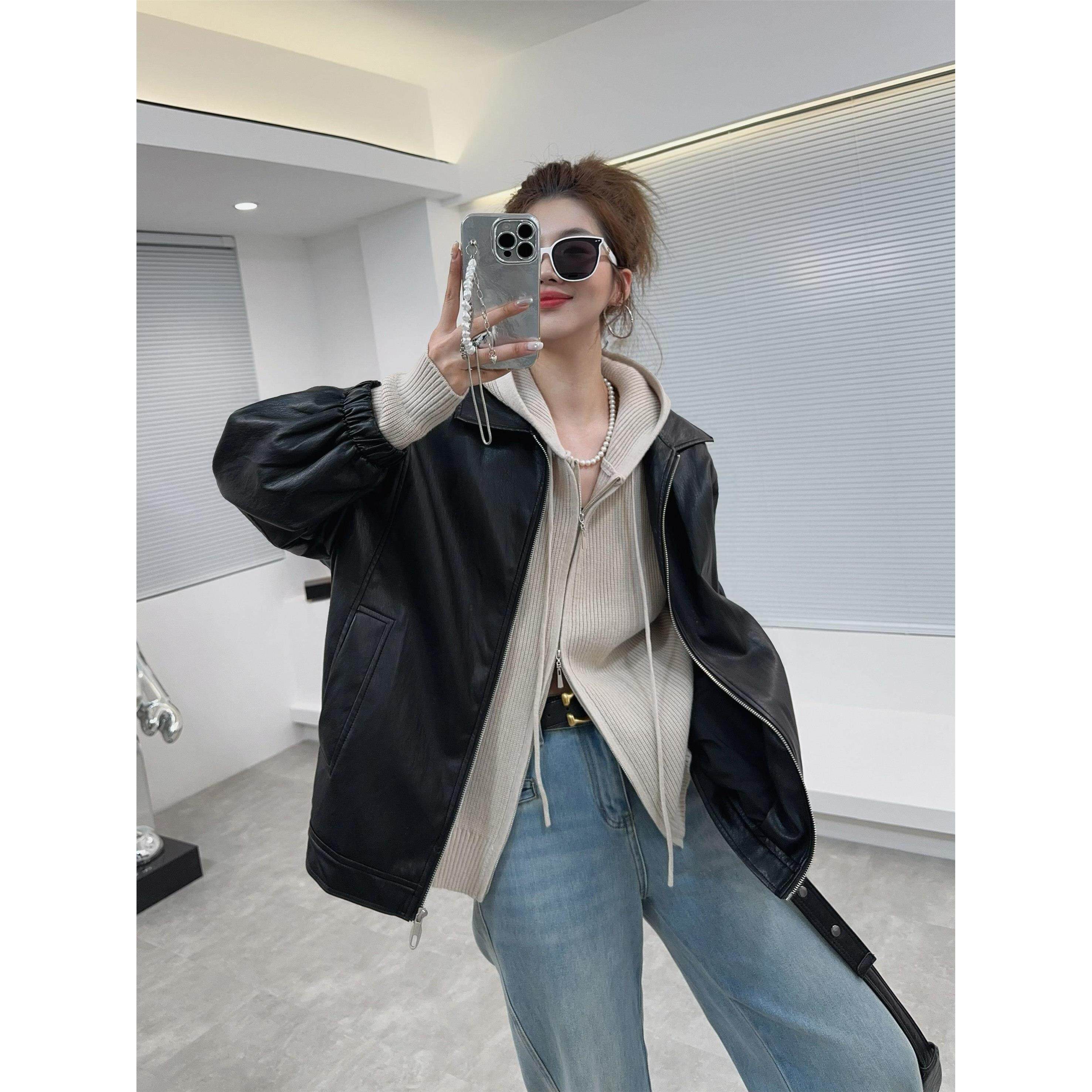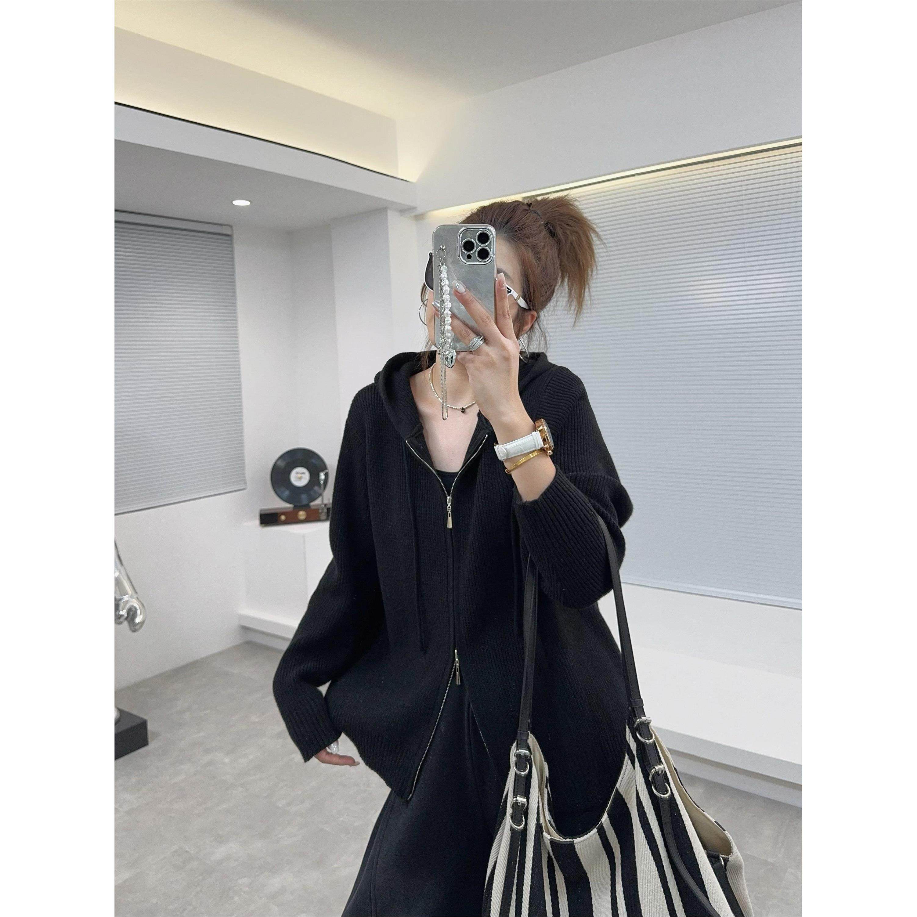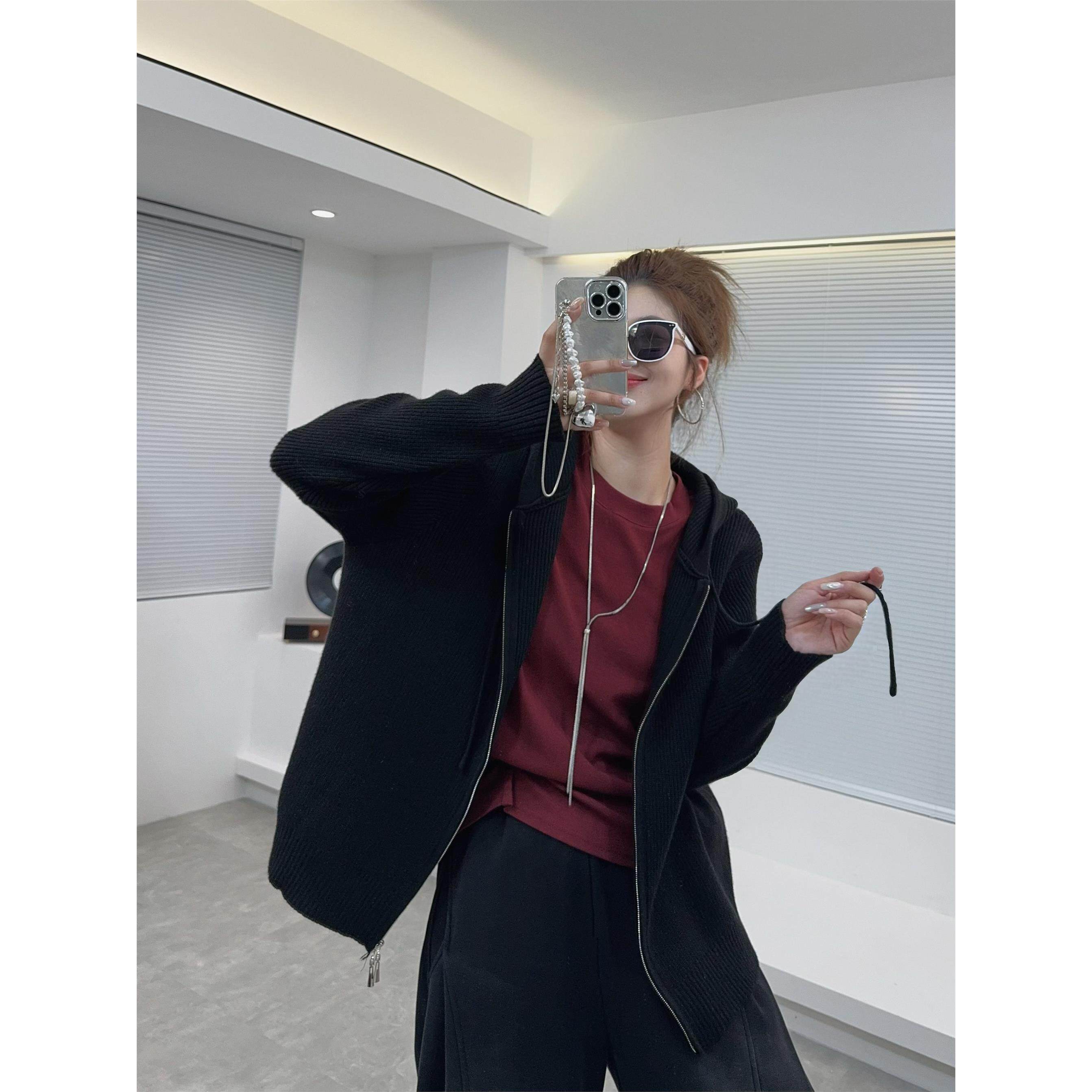 你好菜菜 双拉炼连帽针织卫衣女2025秋冬新款宽松休闲毛衣外套