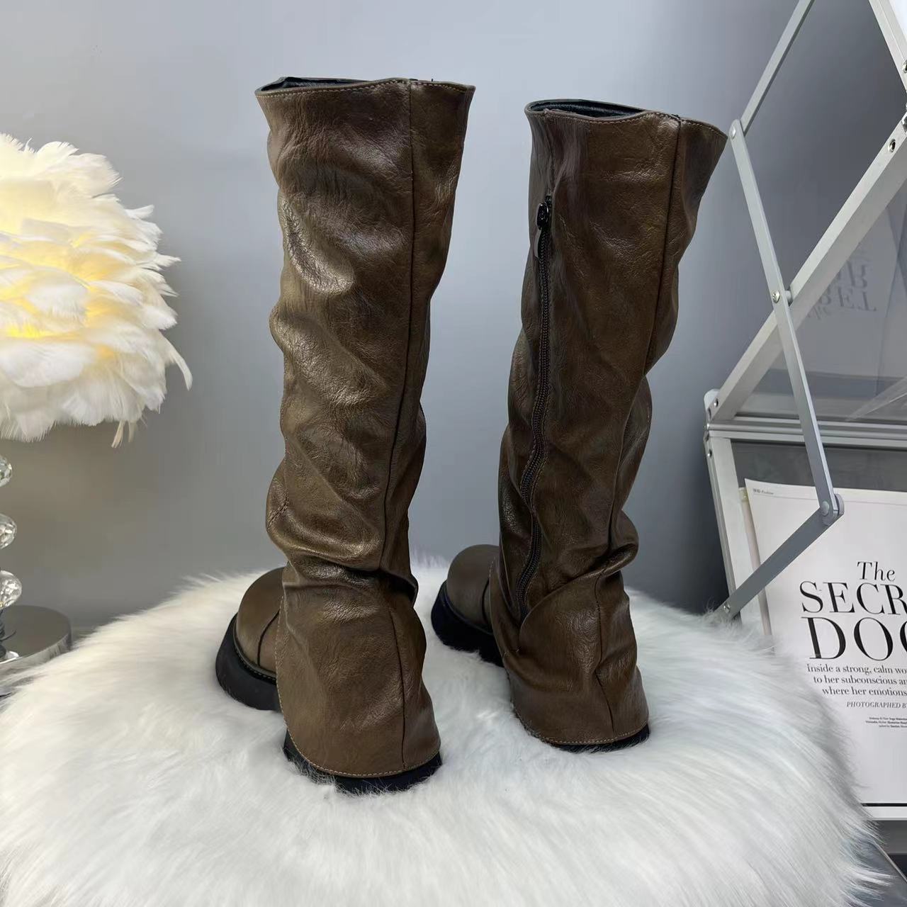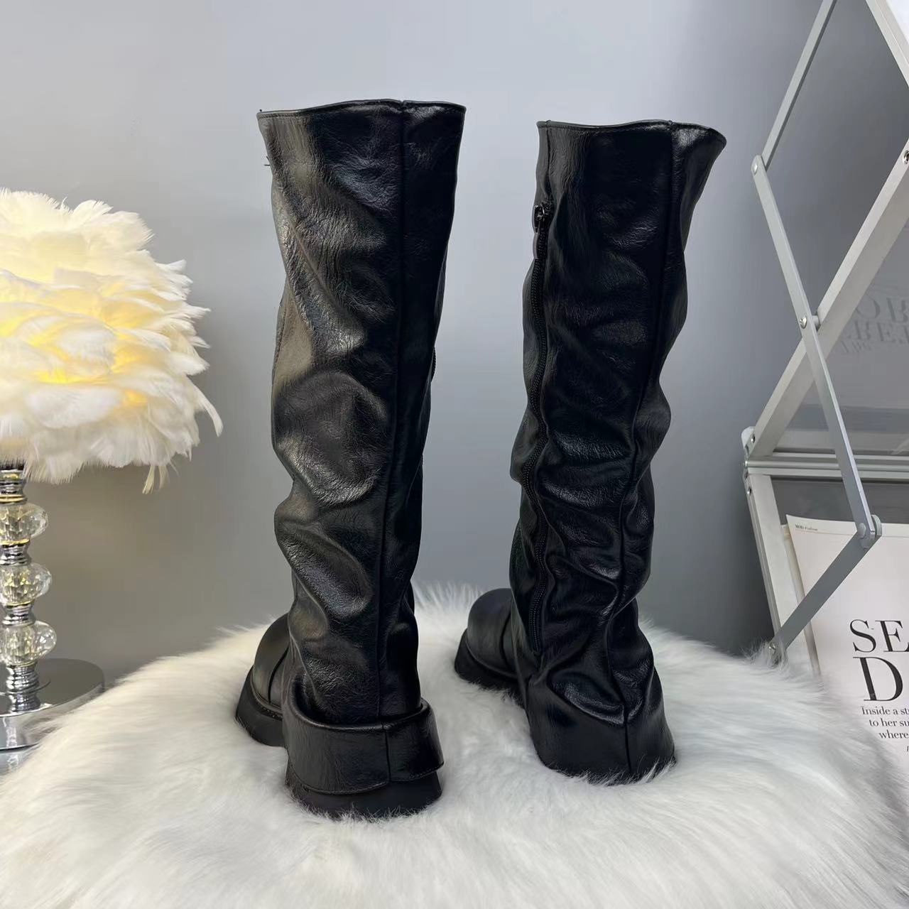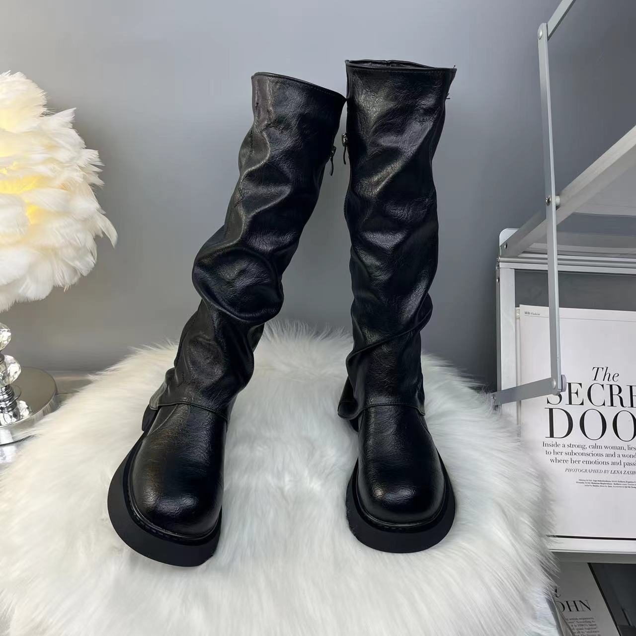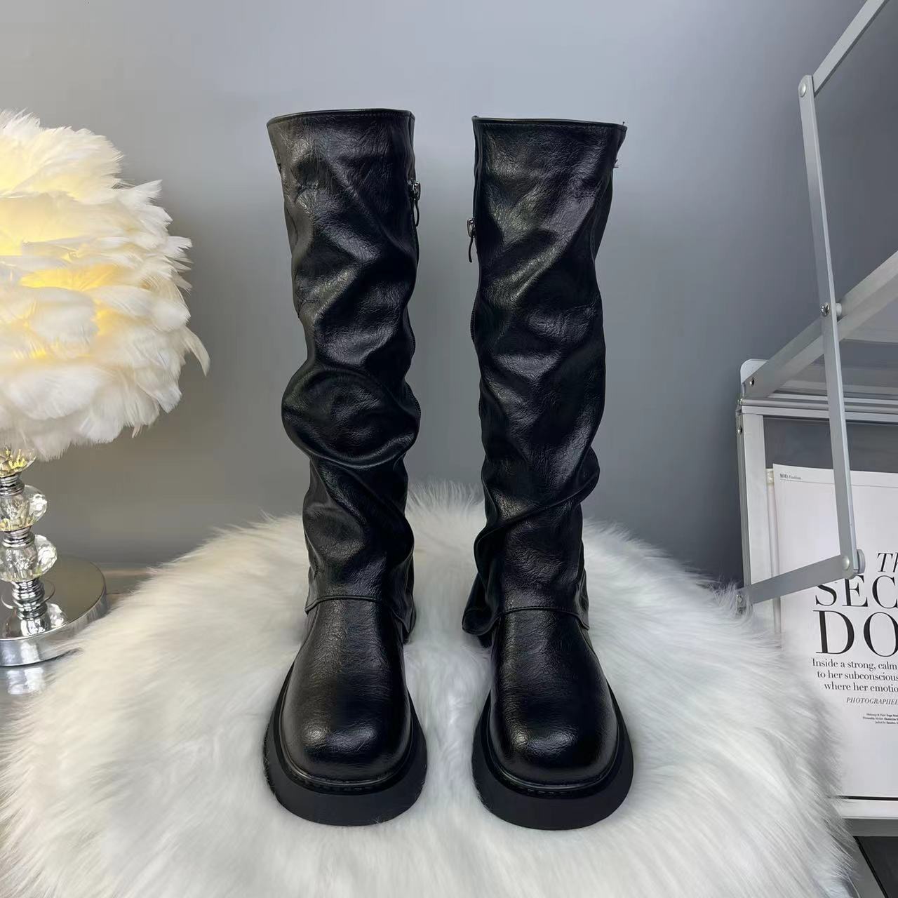 不过膝新款皮扣褶皱圆头个性骑士靴阔腿靴女显瘦英伦风复古长靴