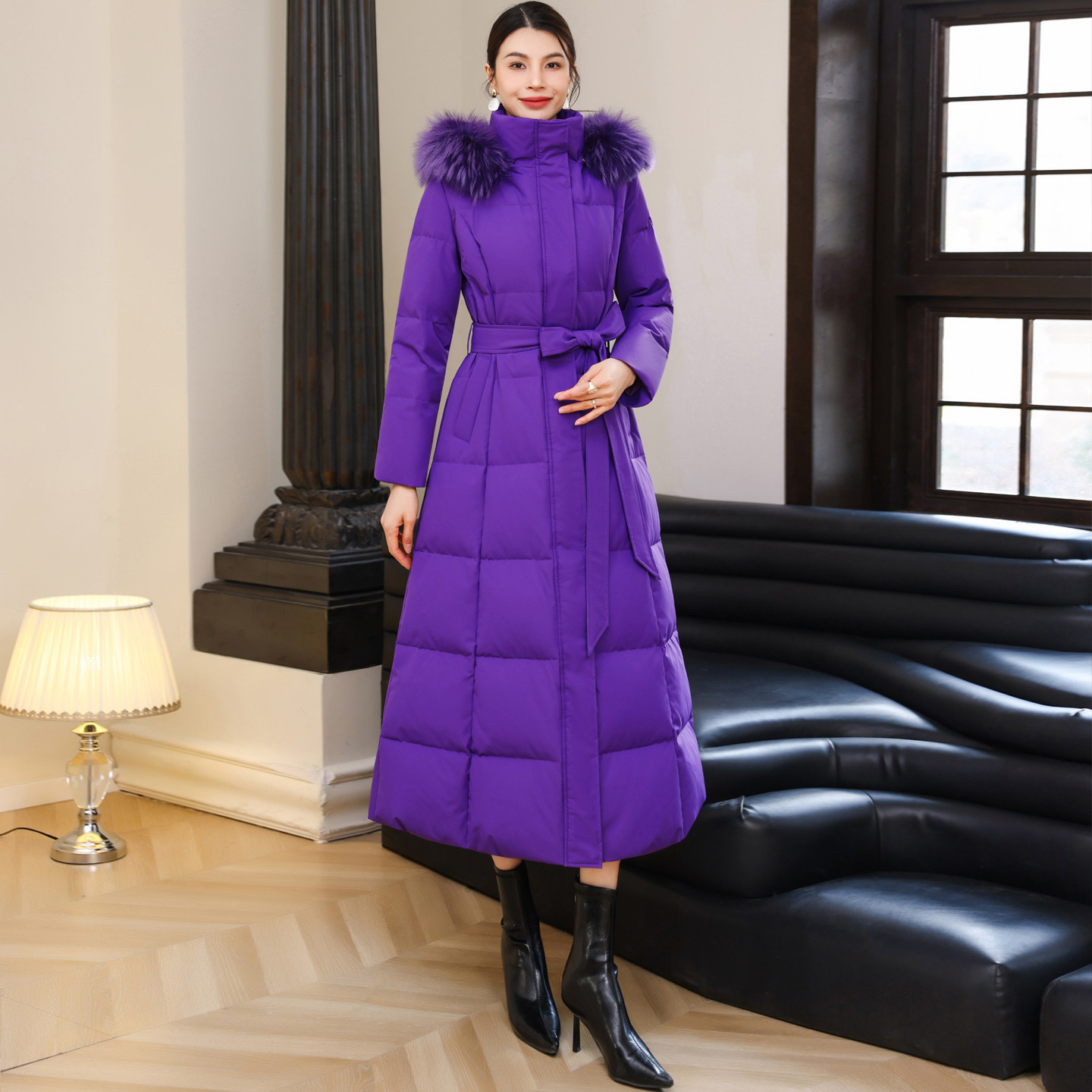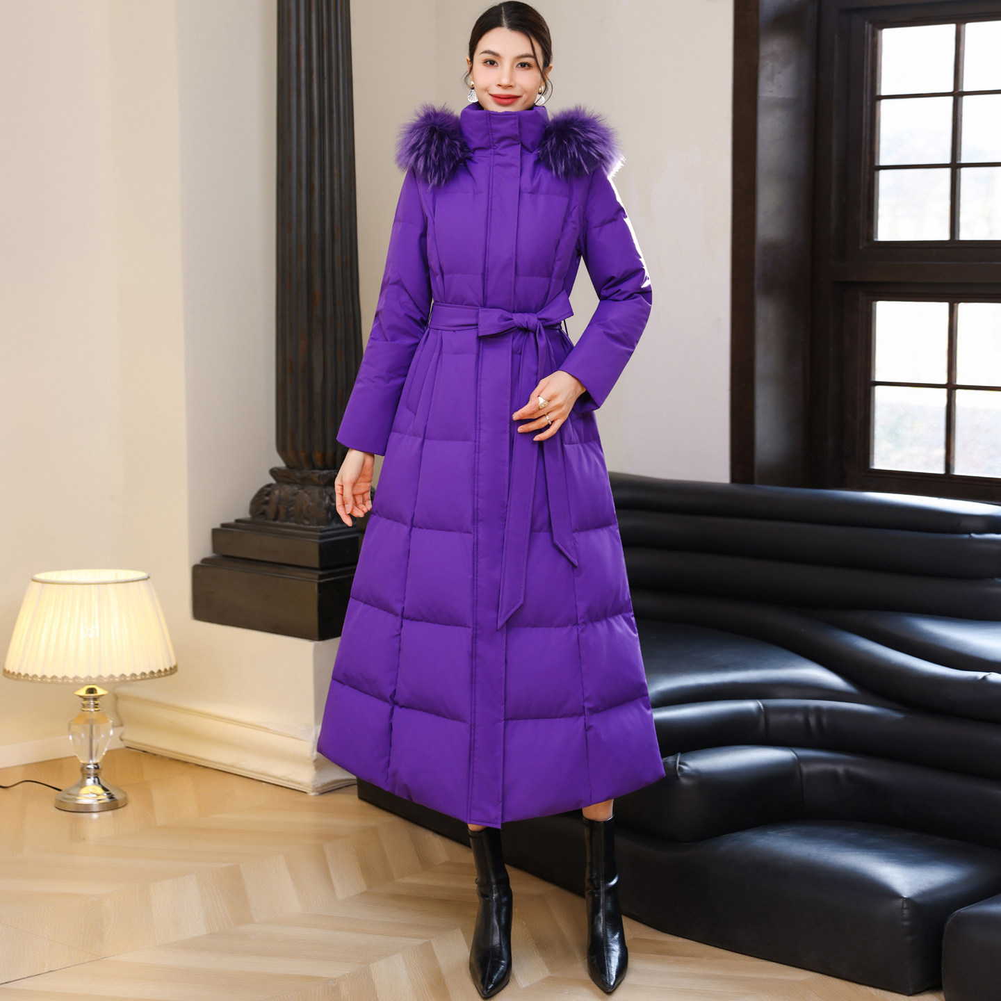 冬季新款显瘦过膝毛领外套长款保暖加厚修身紫色连帽立领羽绒服女