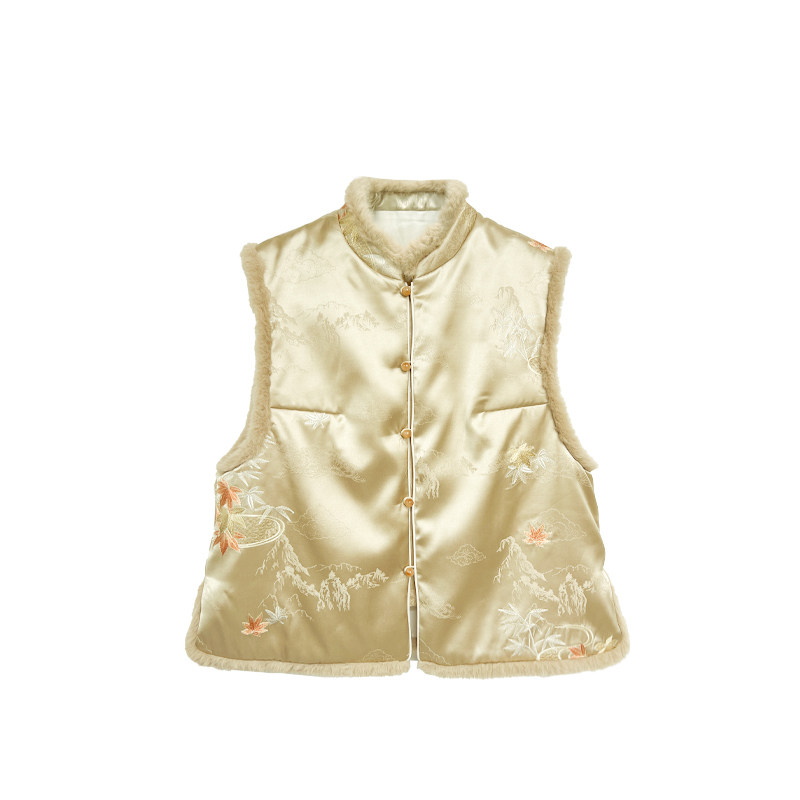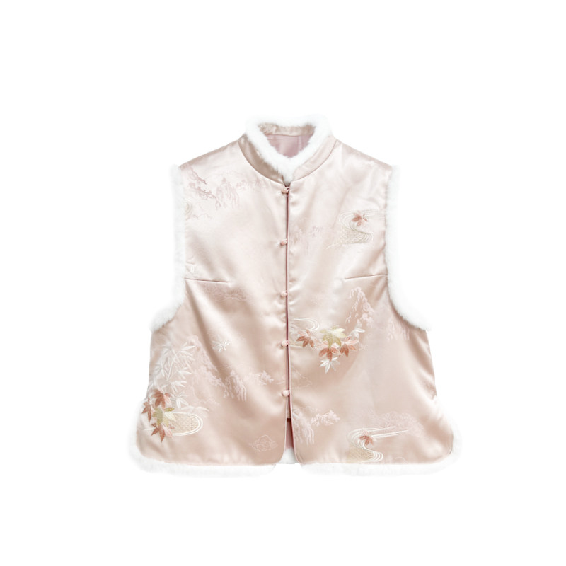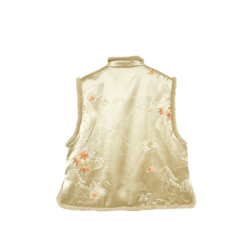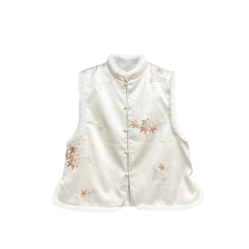【橙庐】511805原创新中式云山枫叶刺绣毛领夹毛马甲 秋冬女国风