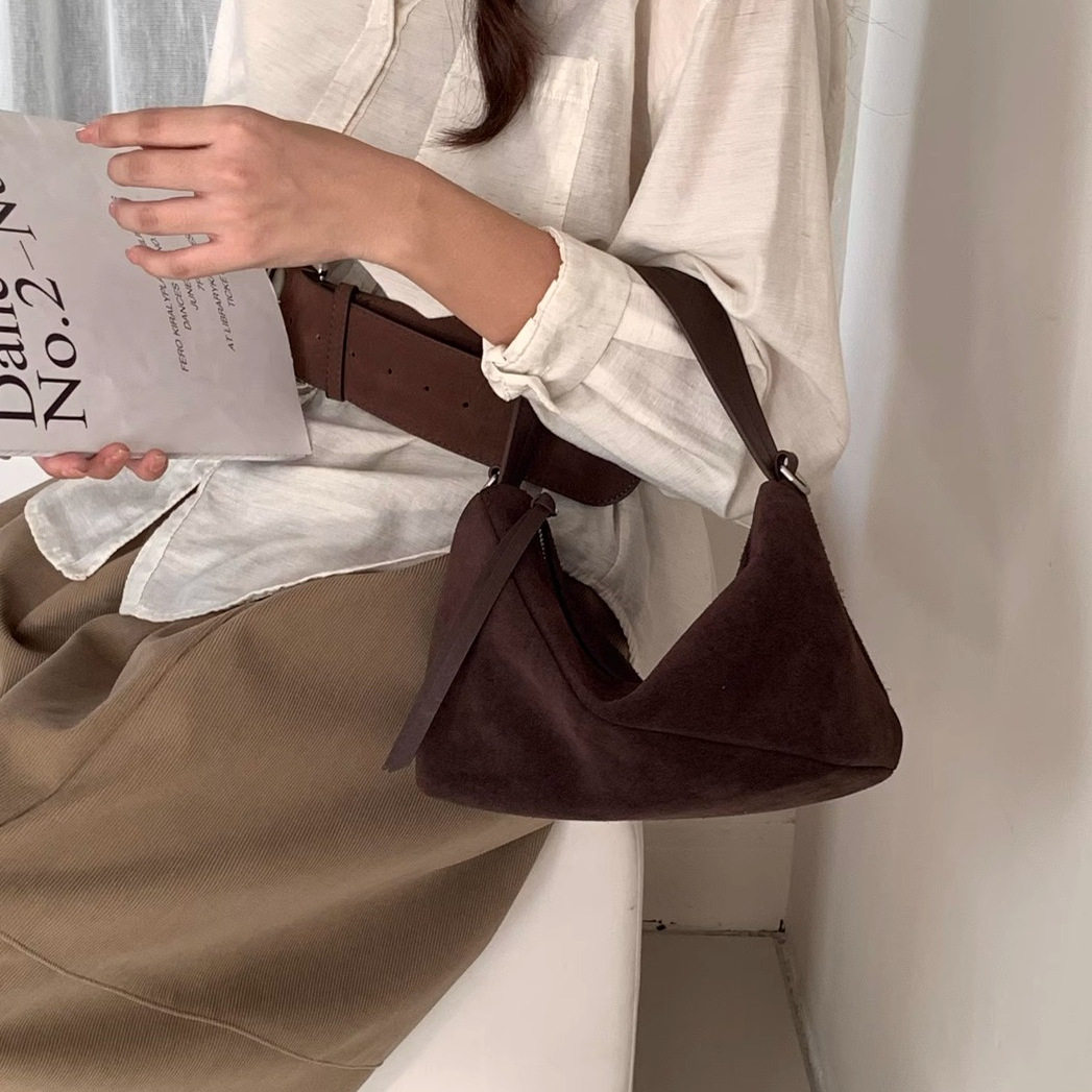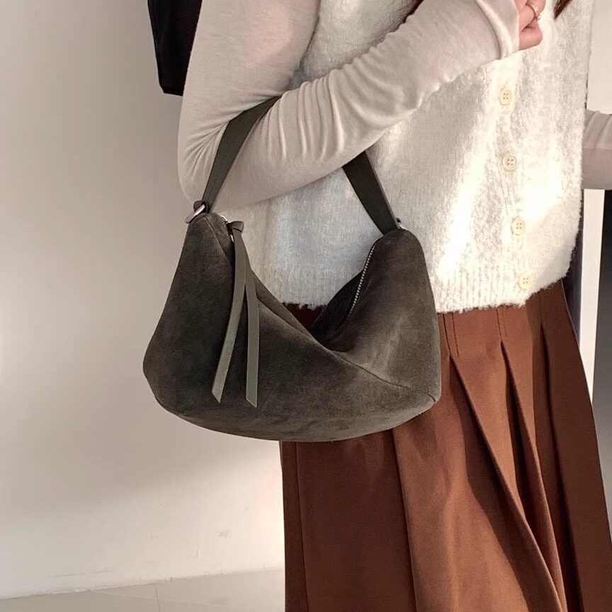 麂皮反绒牛皮饺子包2025新款小众真皮磨砂饭盒包手提单肩包斜挎包