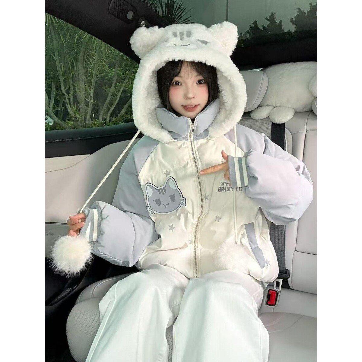 学院风猫咪魔术贴连帽棉服女冬季新款甜美字母刺绣毛球面包服外套