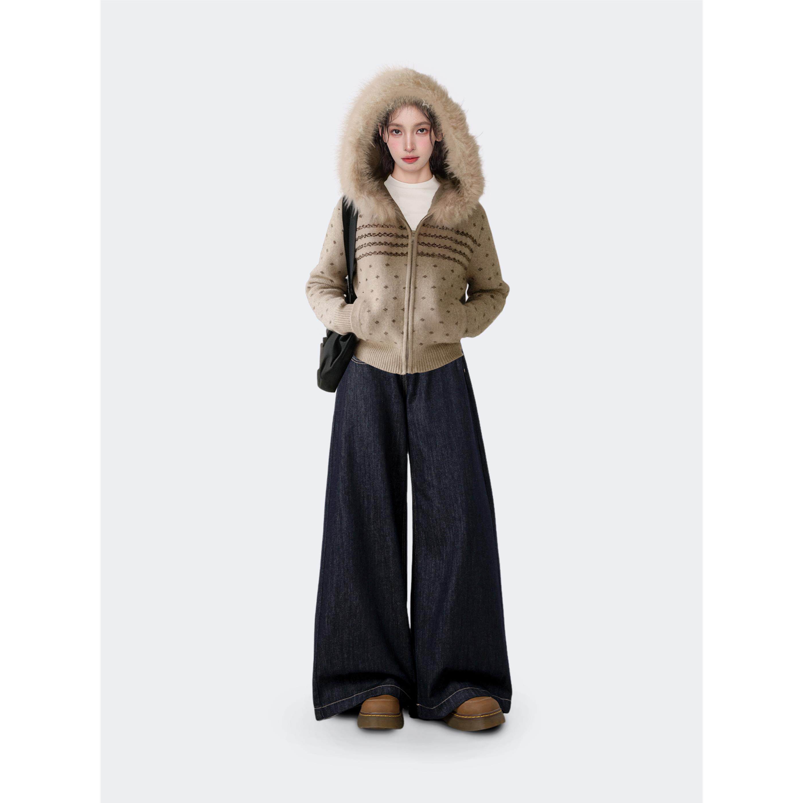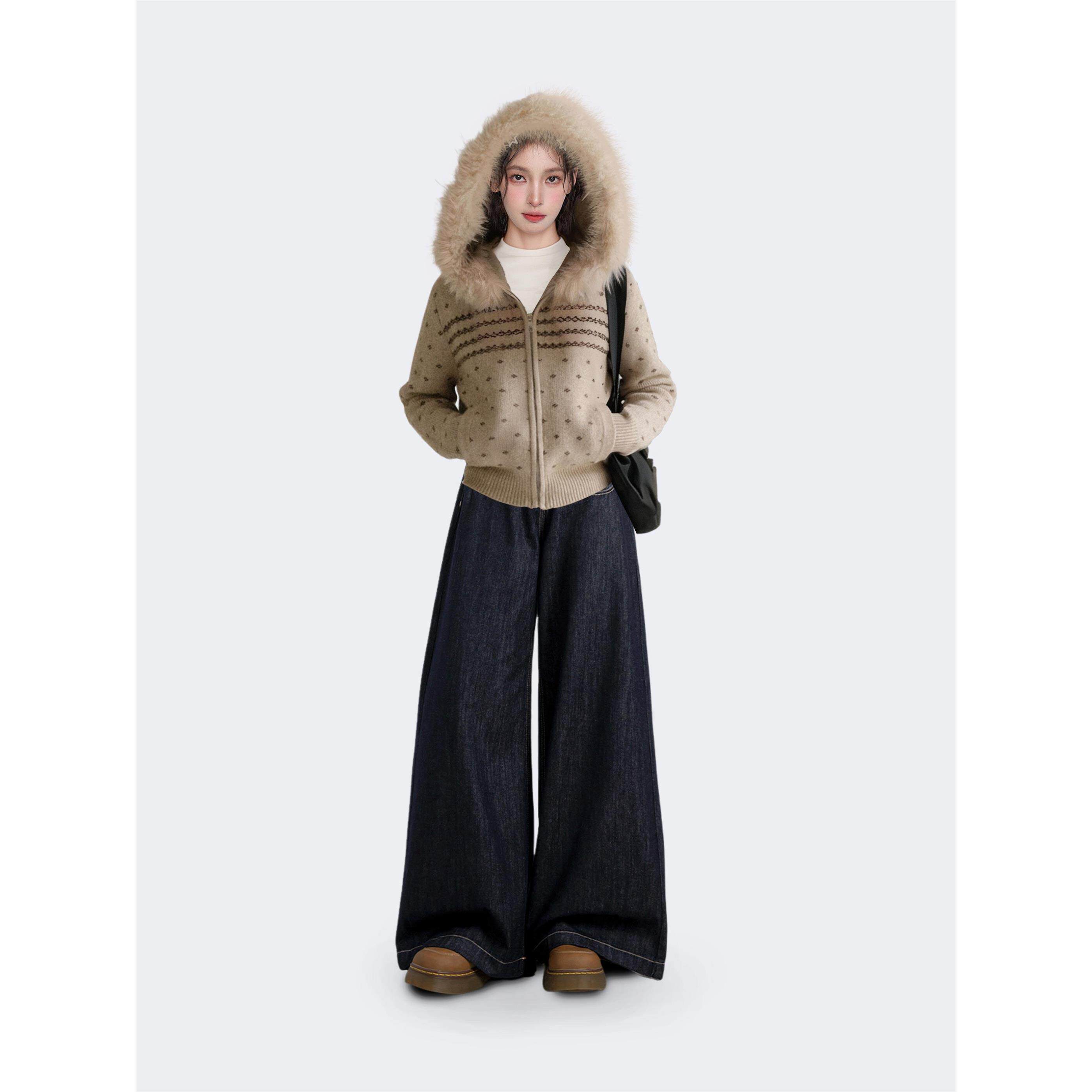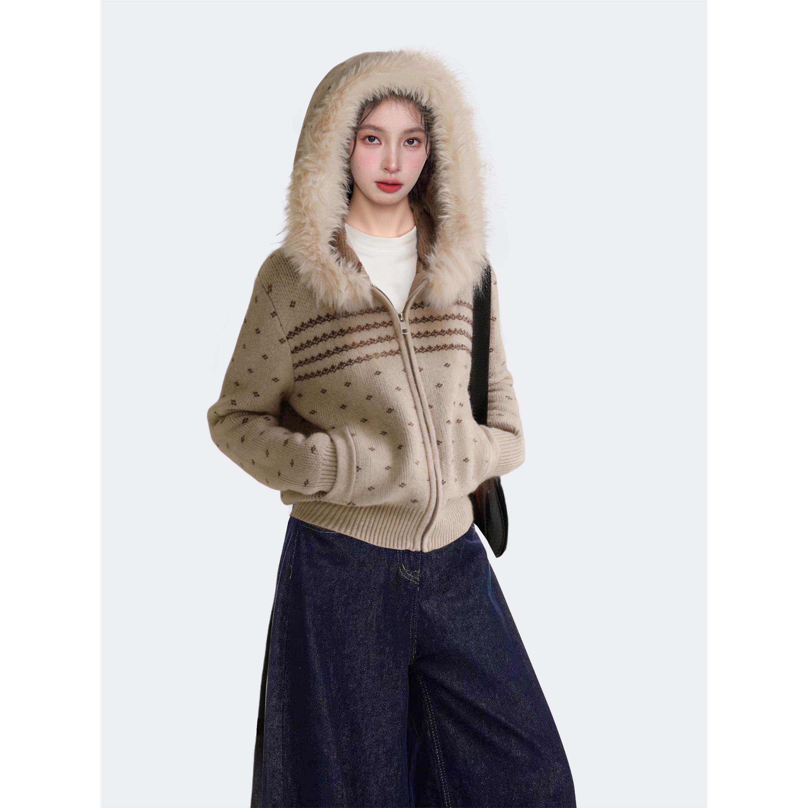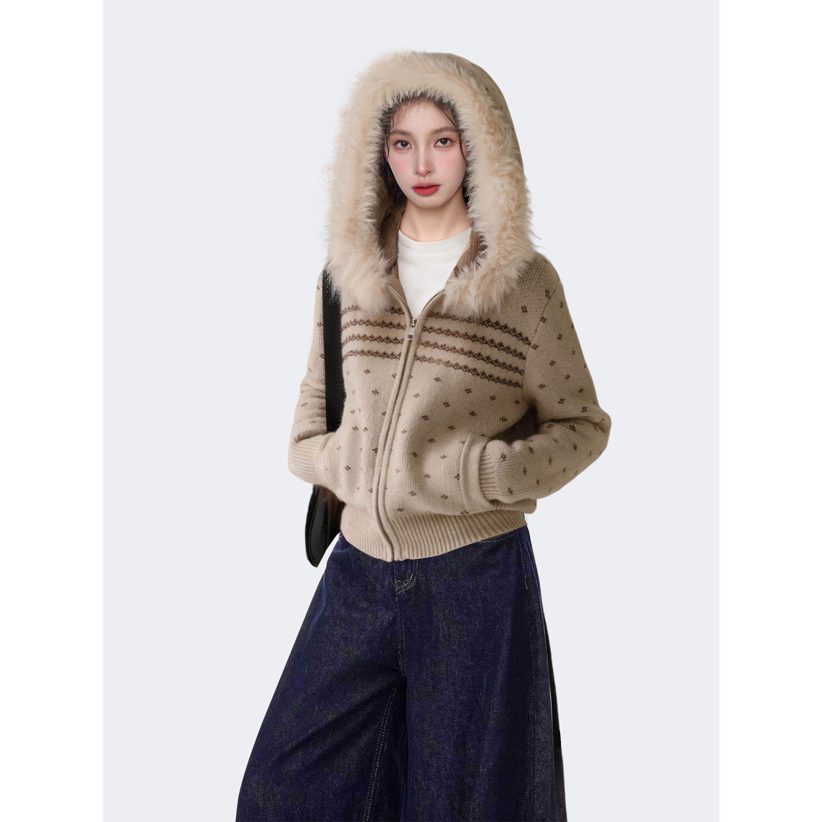 费尔岛连帽毛领拉炼毛衣外套女秋冬冬季加厚短款针织卫衣开衫上衣