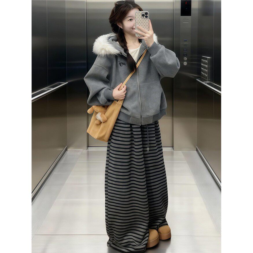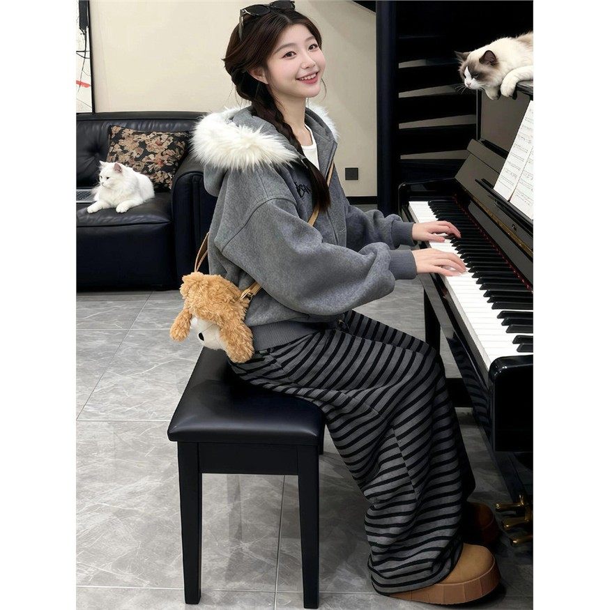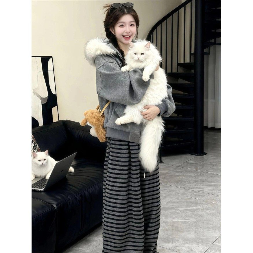 美式覆古毛领毛呢外套女2025秋冬新款慵懒感加厚宽松连帽灰色卫衣