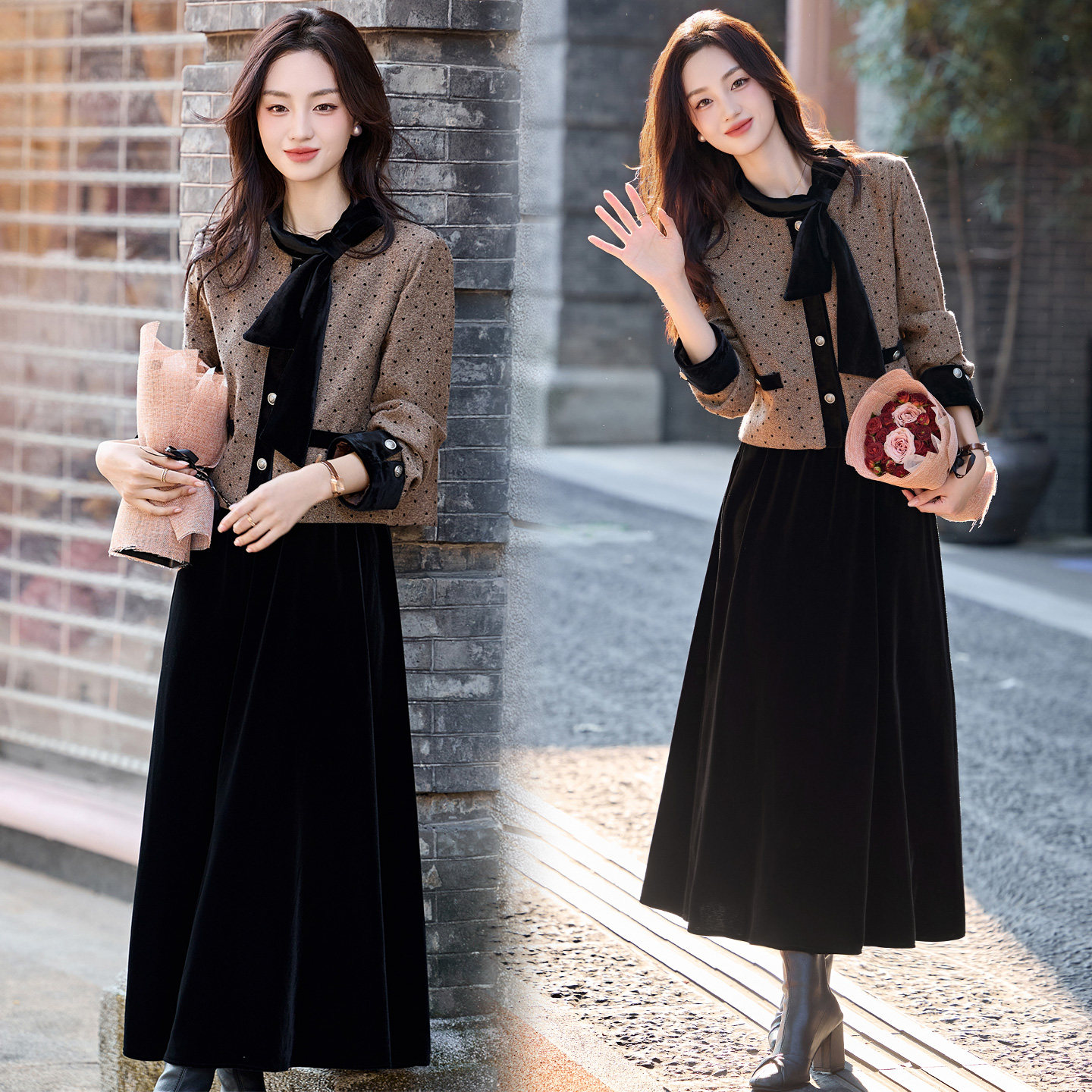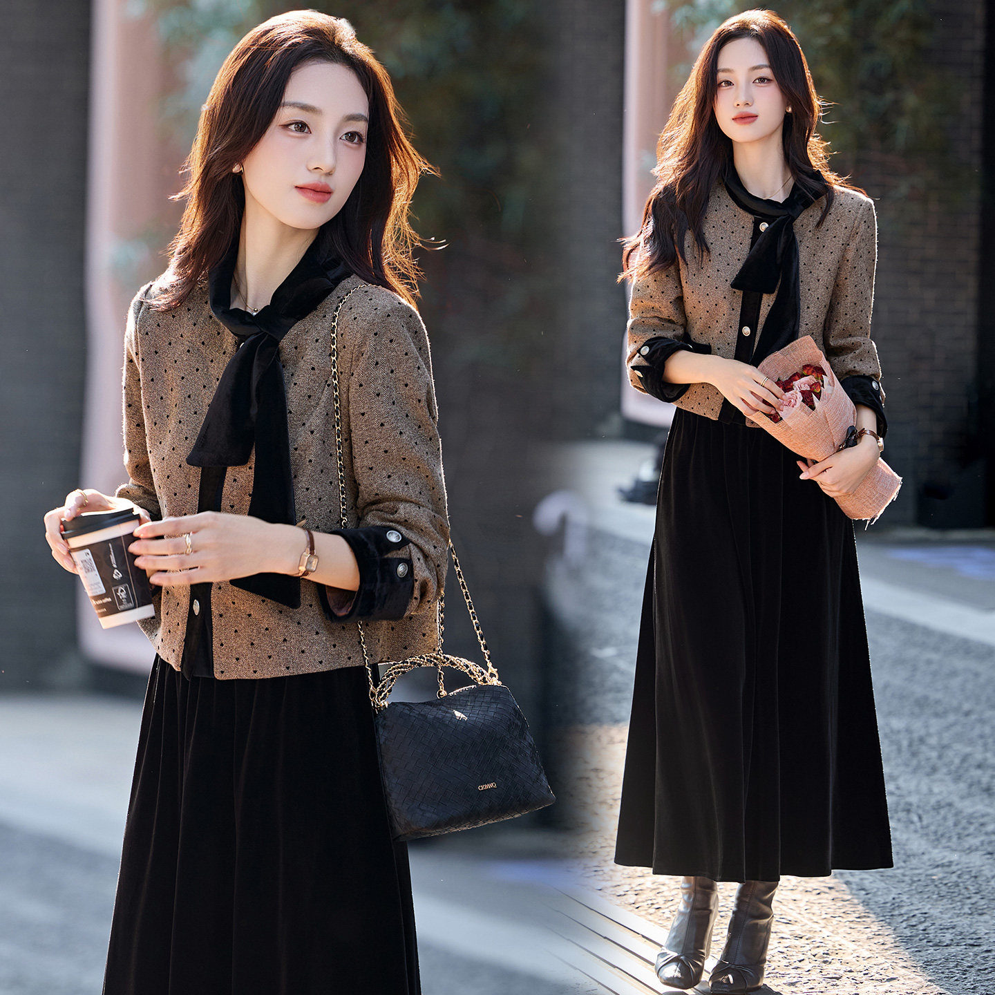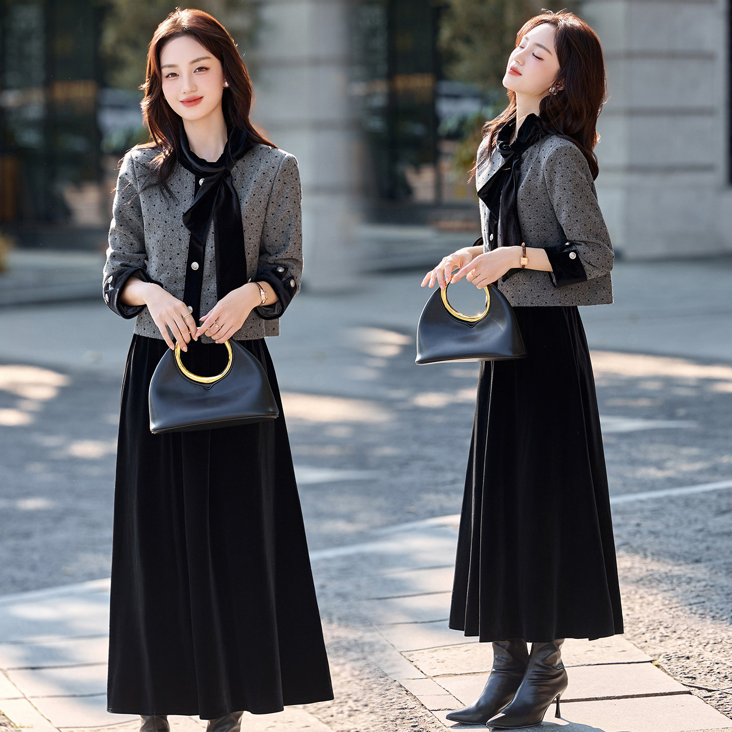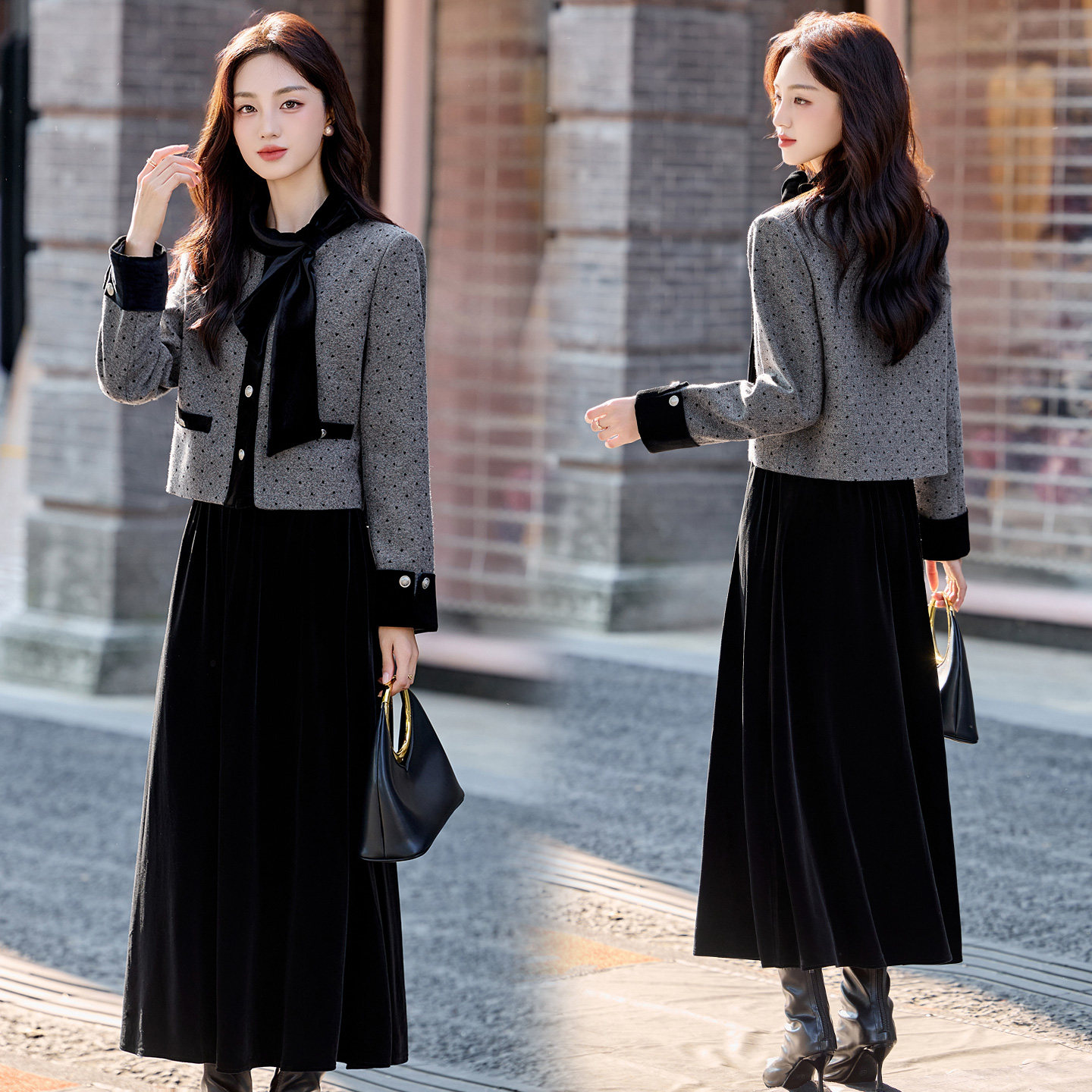 现货设计感蝴蝶结圆领上衣女时髦小香名媛风两件套套装裙