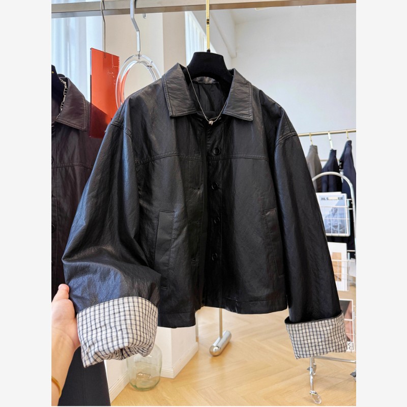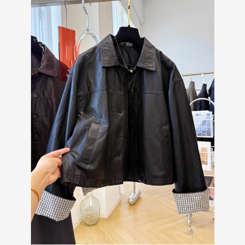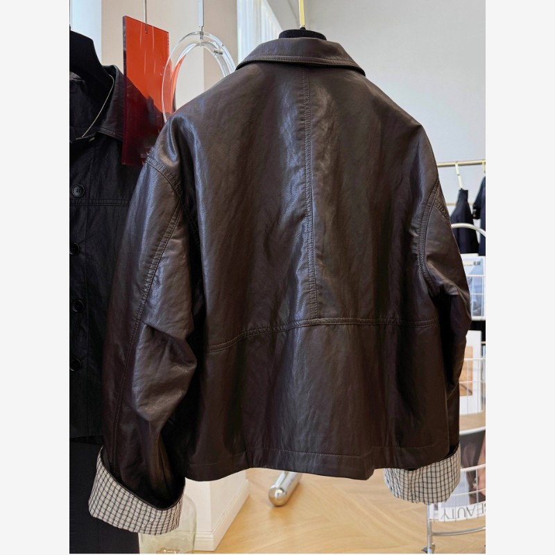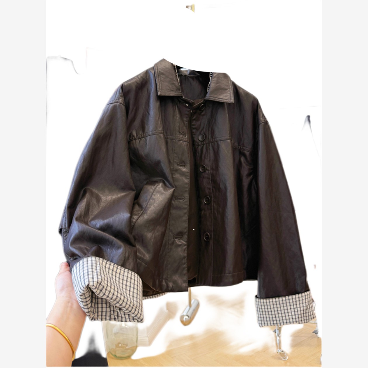 翻领pu皮衣外套女2025秋季新款宽松休闲排扣格子拼接短款夹克上衣