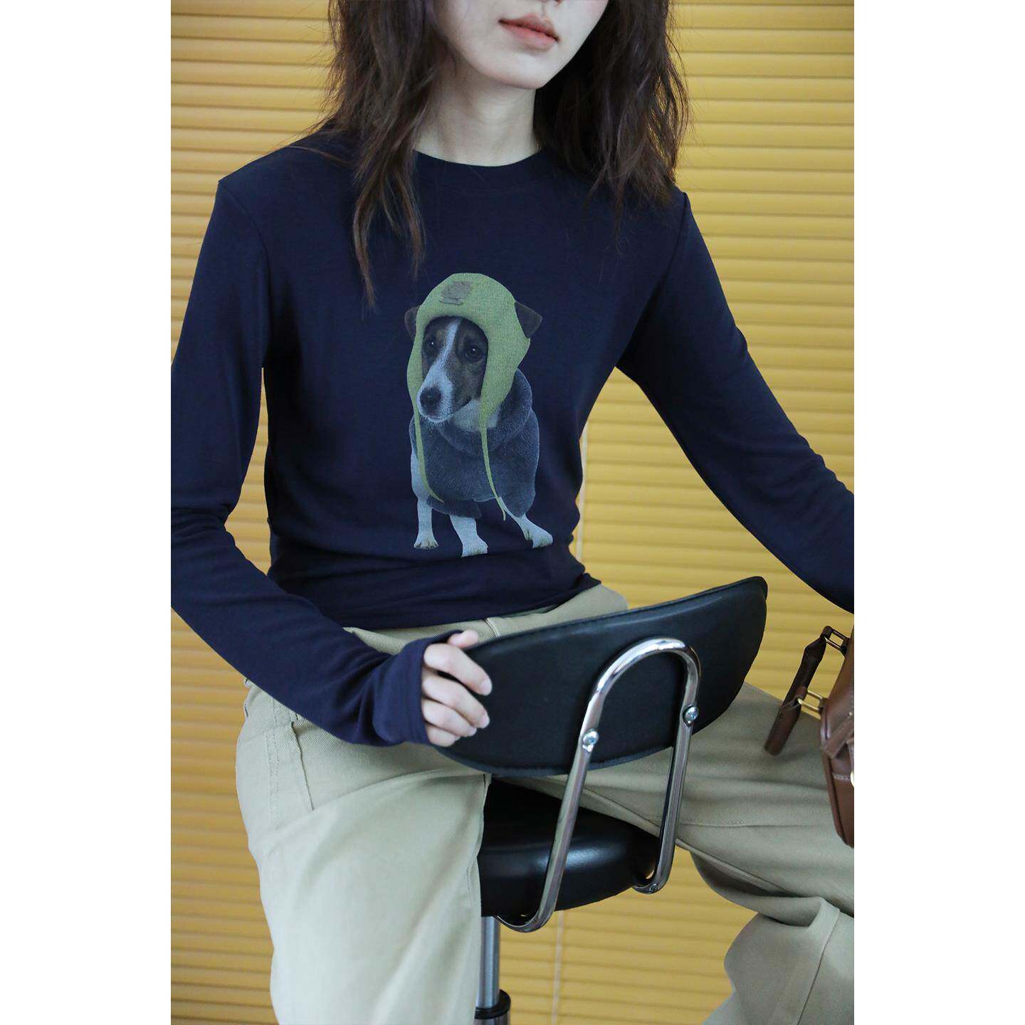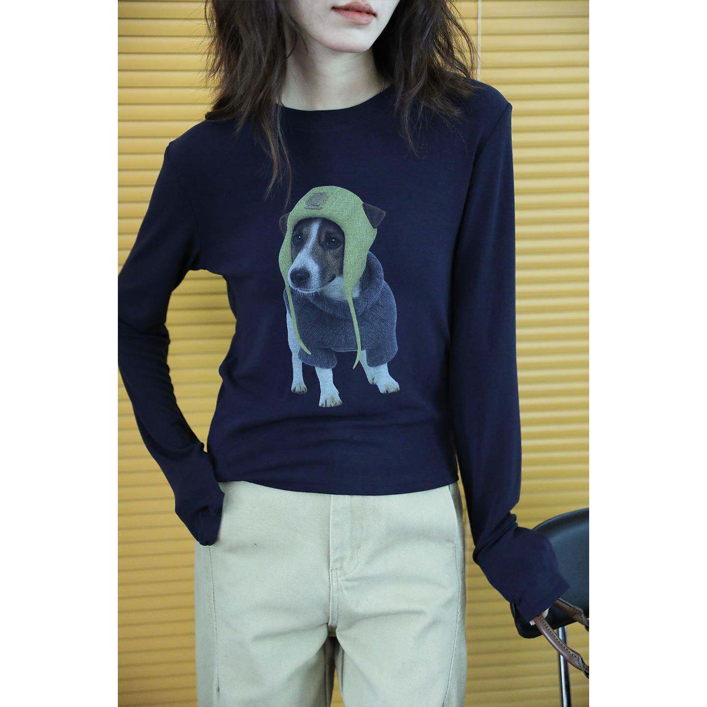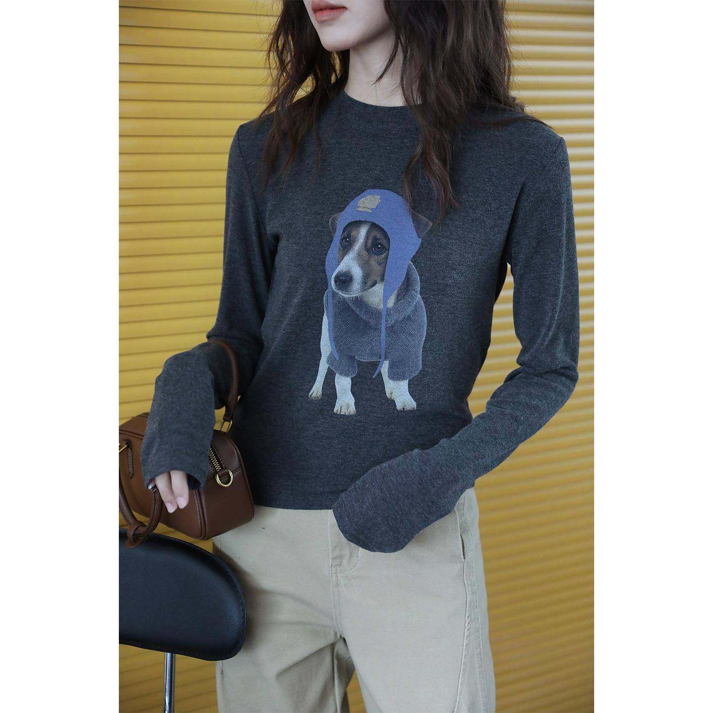 深灰色印花卡通小狗显瘦小众长袖T恤女秋季新款软糯百搭打底衫