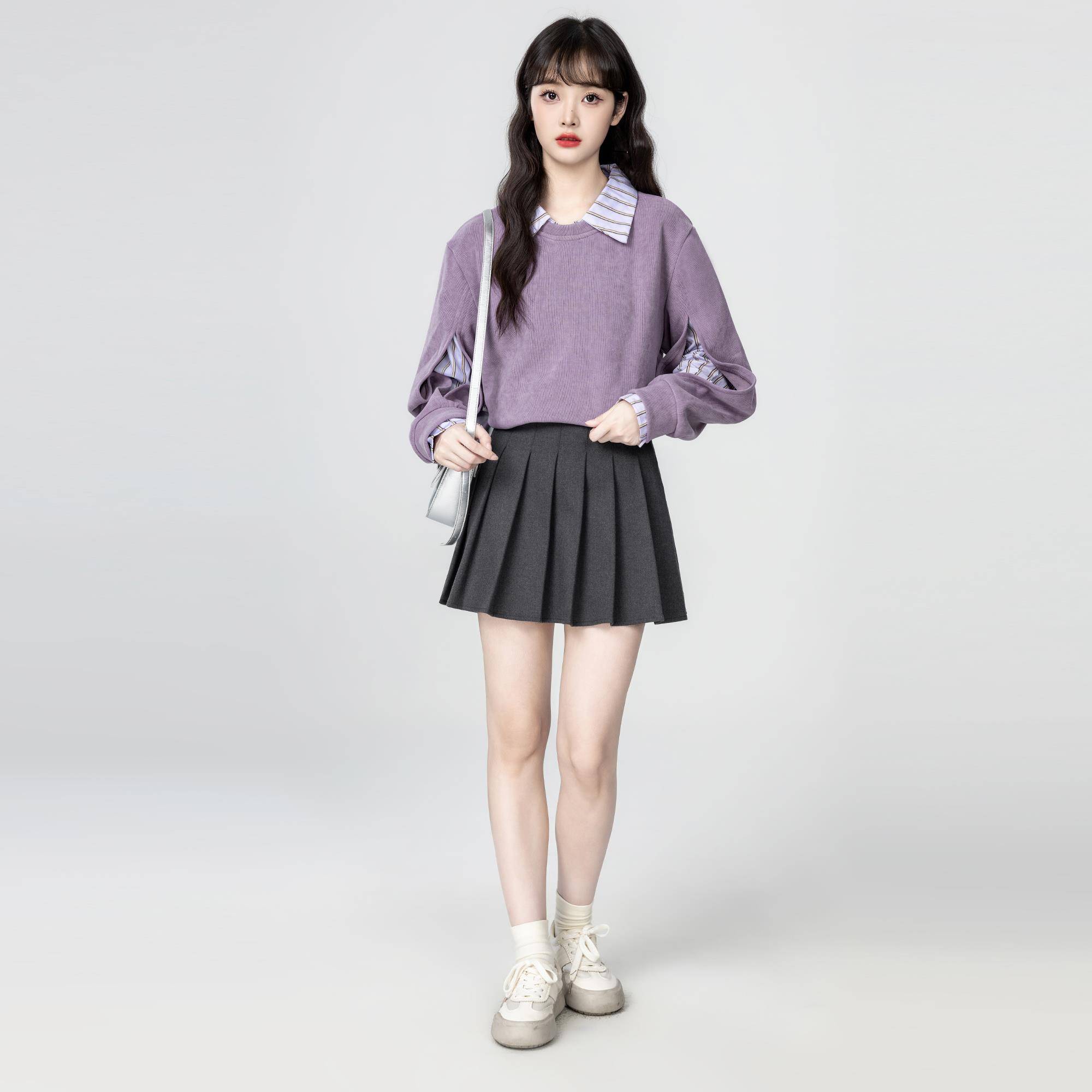 紫色POLO领卫衣女春秋2025秋季新款设计感假两件拼接衬衫套头上衣