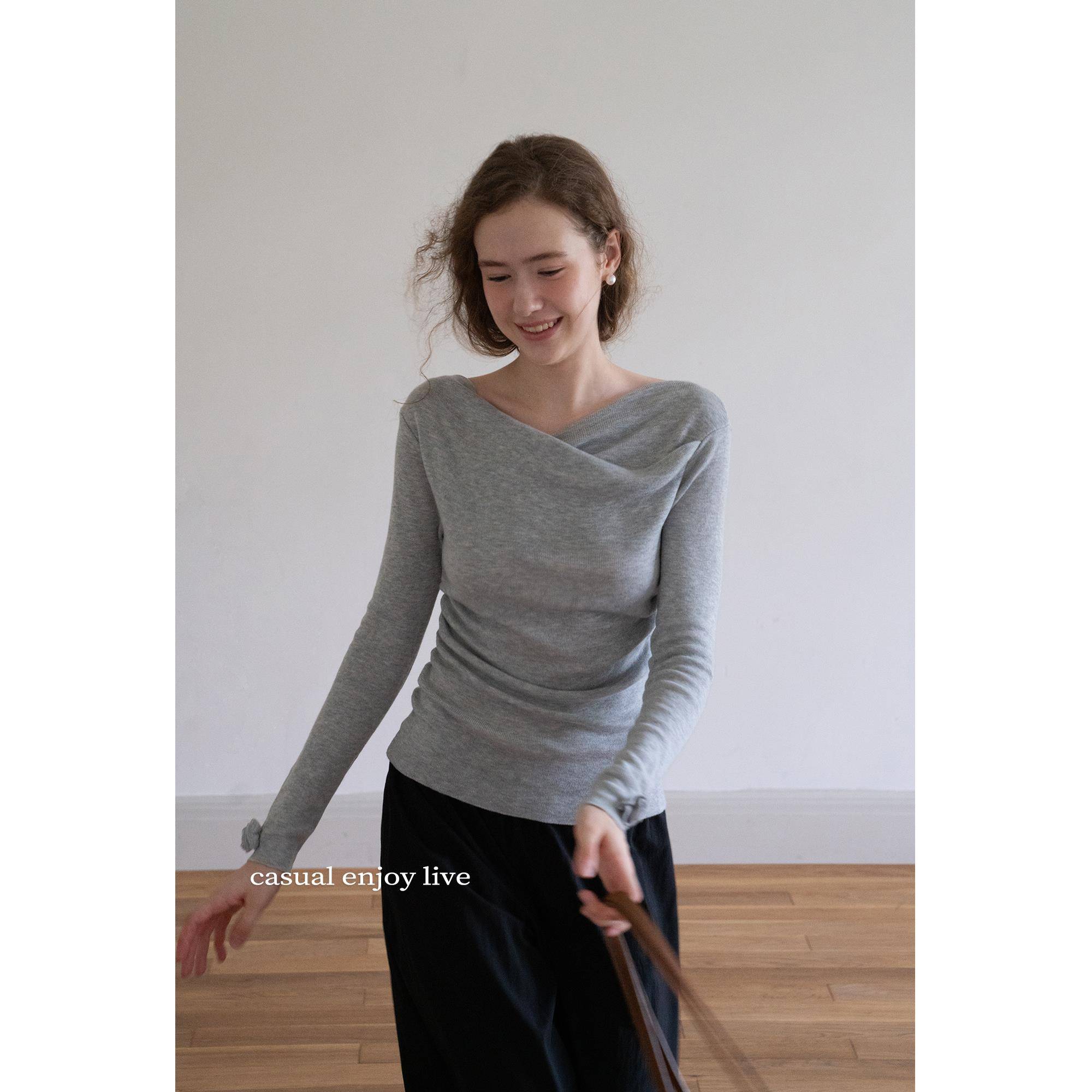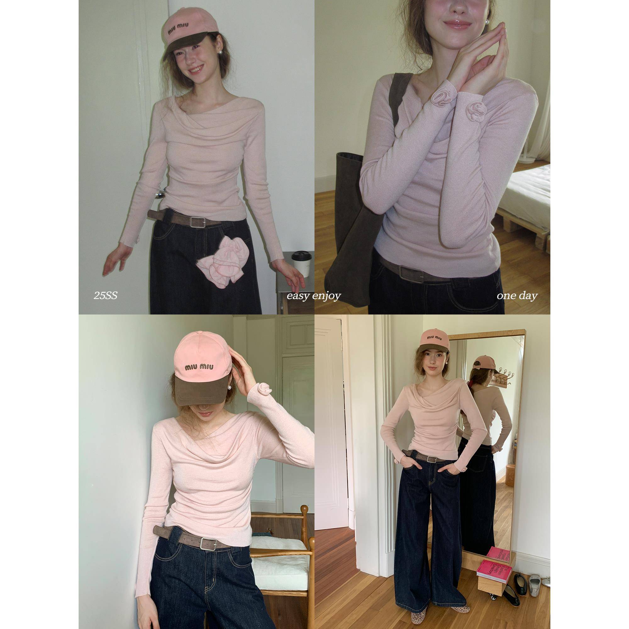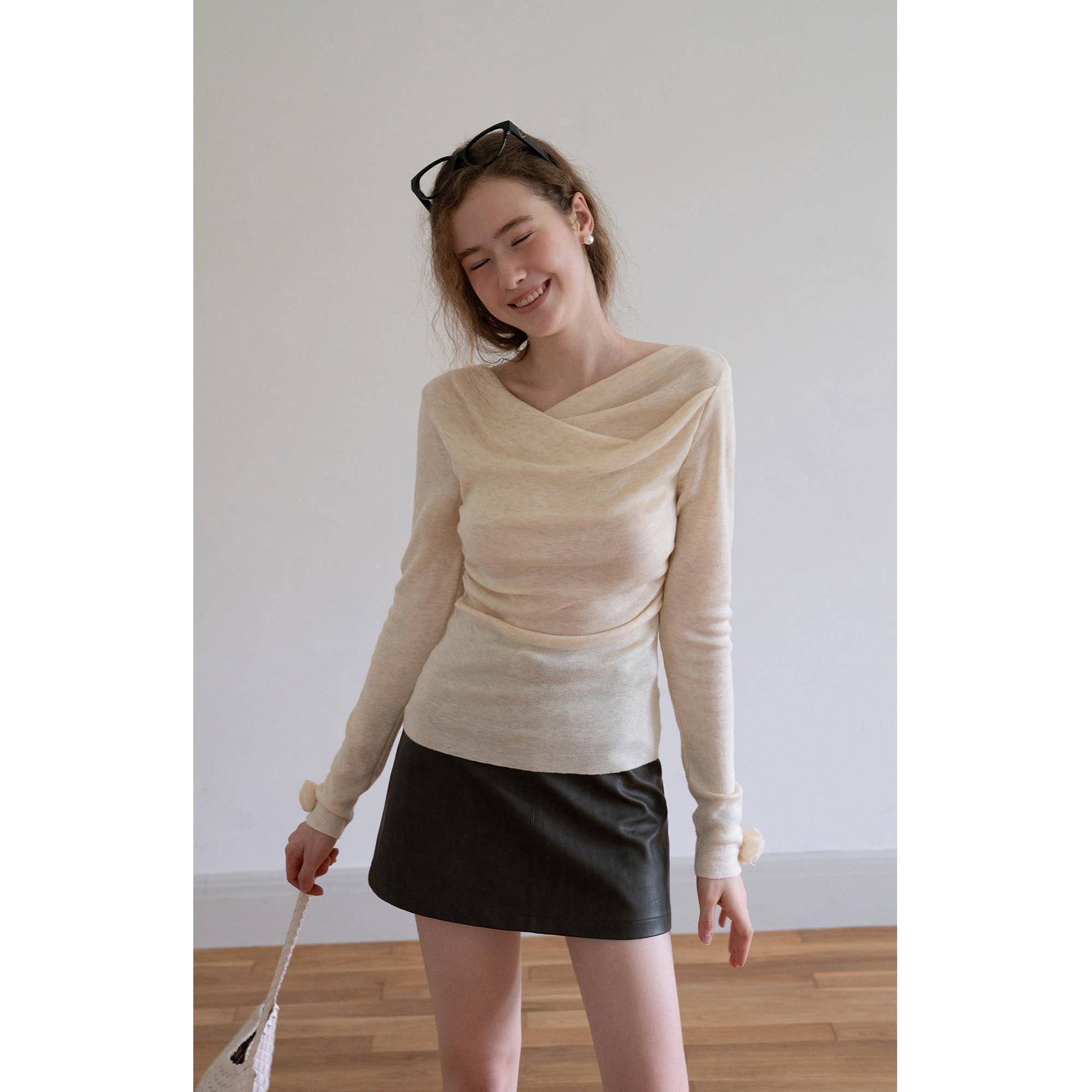EGGKA法式荡领长袖一字肩粉色针织衫女秋季收腰气质显瘦温柔上衣
