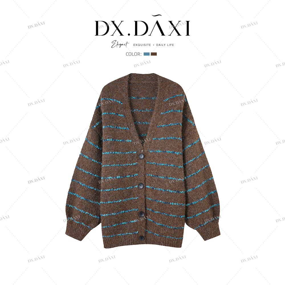DX.DAXI【条纹日报】撞色条纹宽松针织开衫百搭时尚韩版显瘦外套