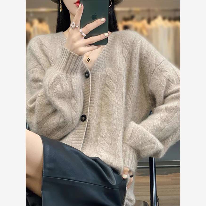 2025春季和秋季新捻开司米毛衣针织开襟羊毛衫女士外套V领宽松开