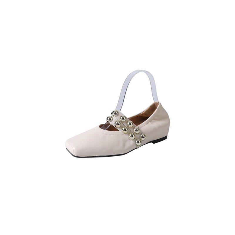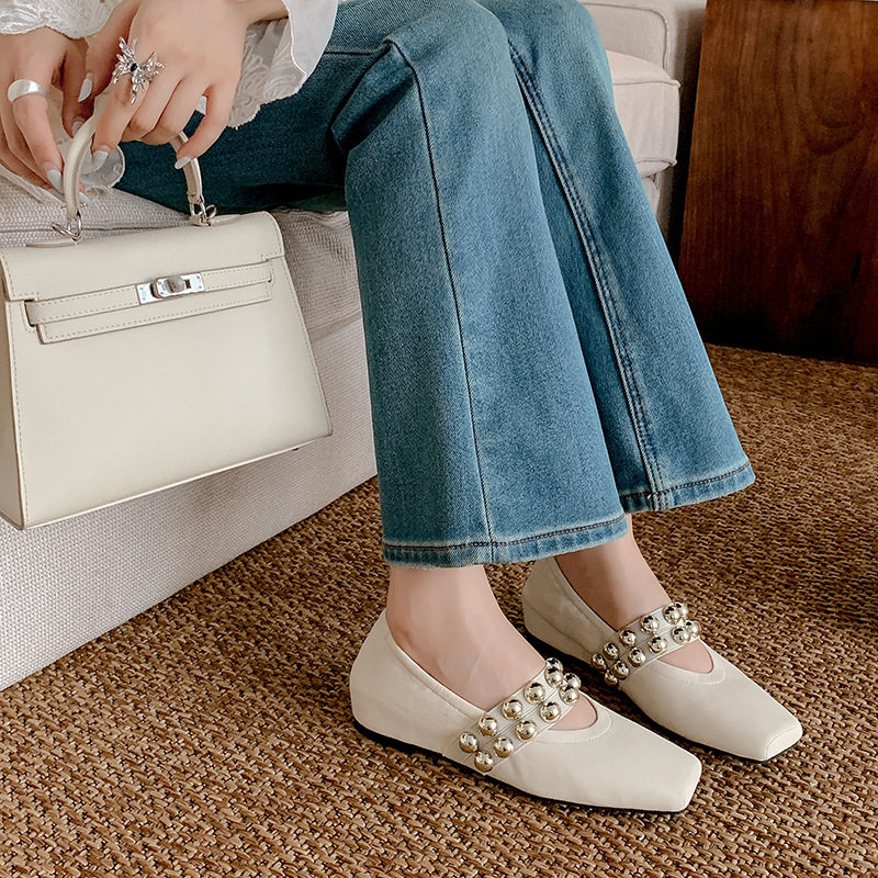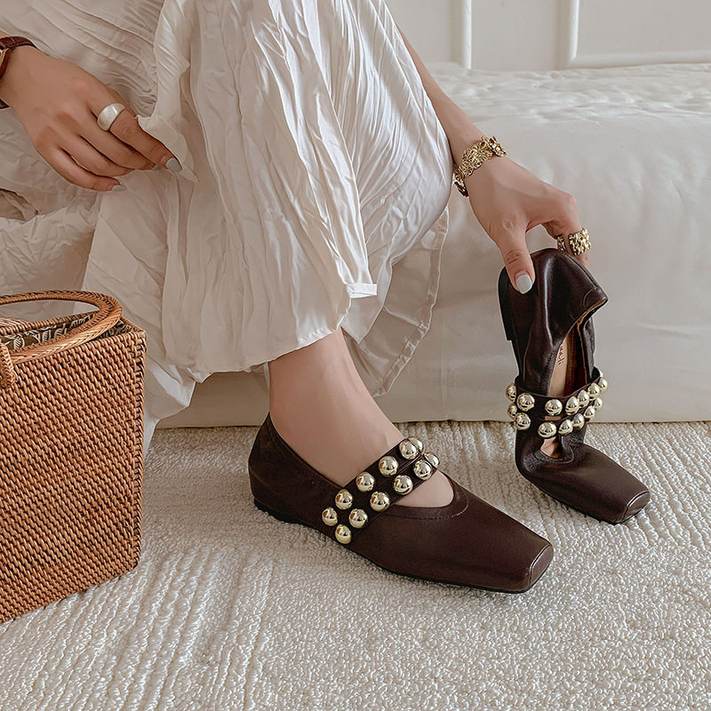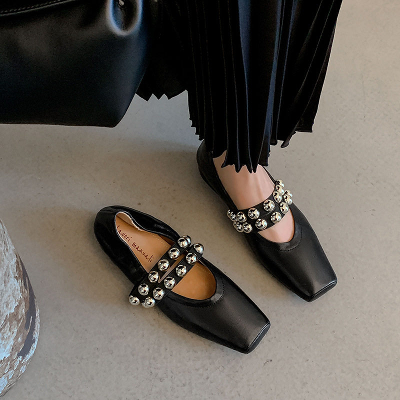 温柔晚风舒适复古褶皱方头低跟奶奶鞋2024秋季浅口铆钉玛丽珍单鞋