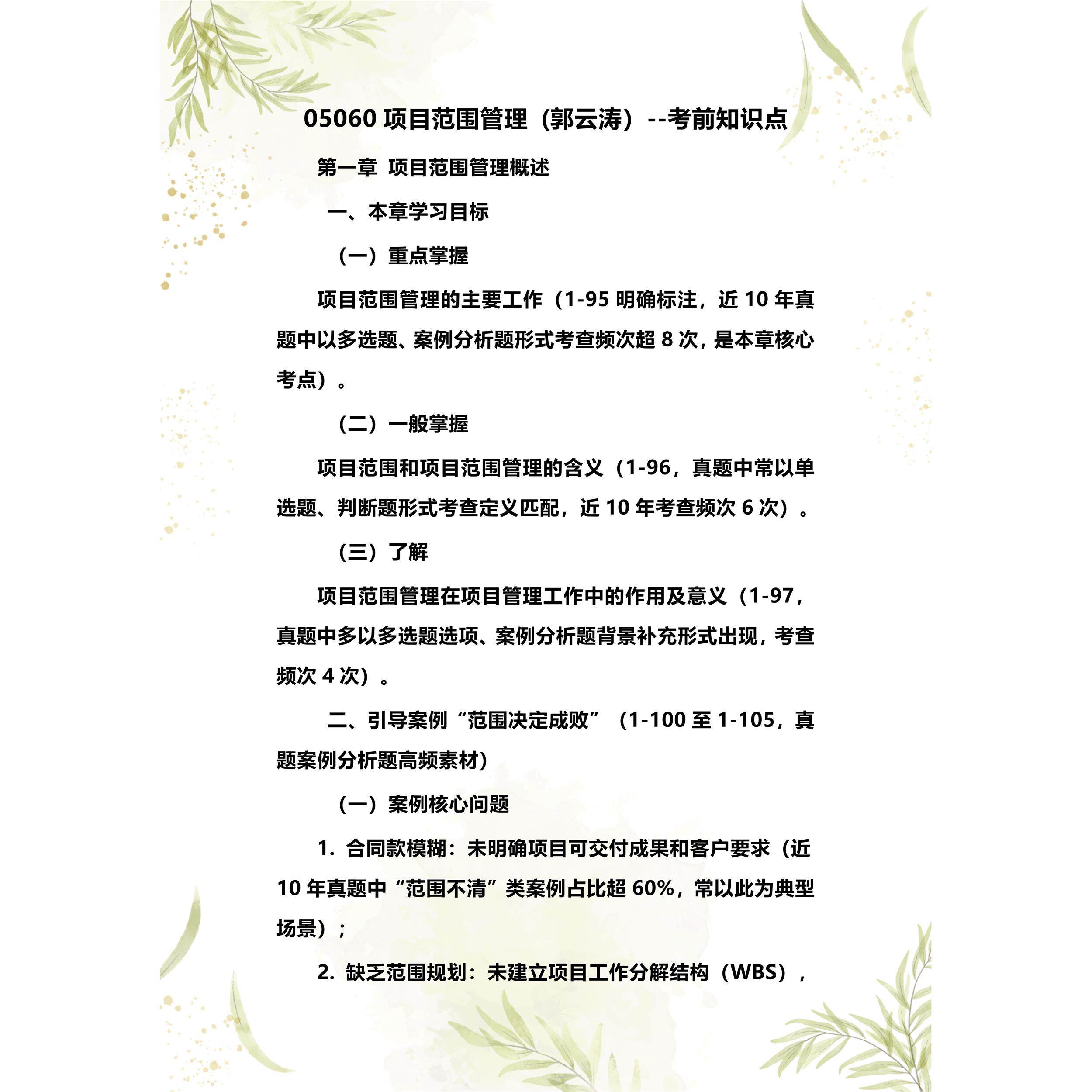 考点重点 05060项目范围管理 (郭云涛) 考纲讲解自考笔记 资料 自考复习过关思维导图 精讲视频网课 考前押题资料