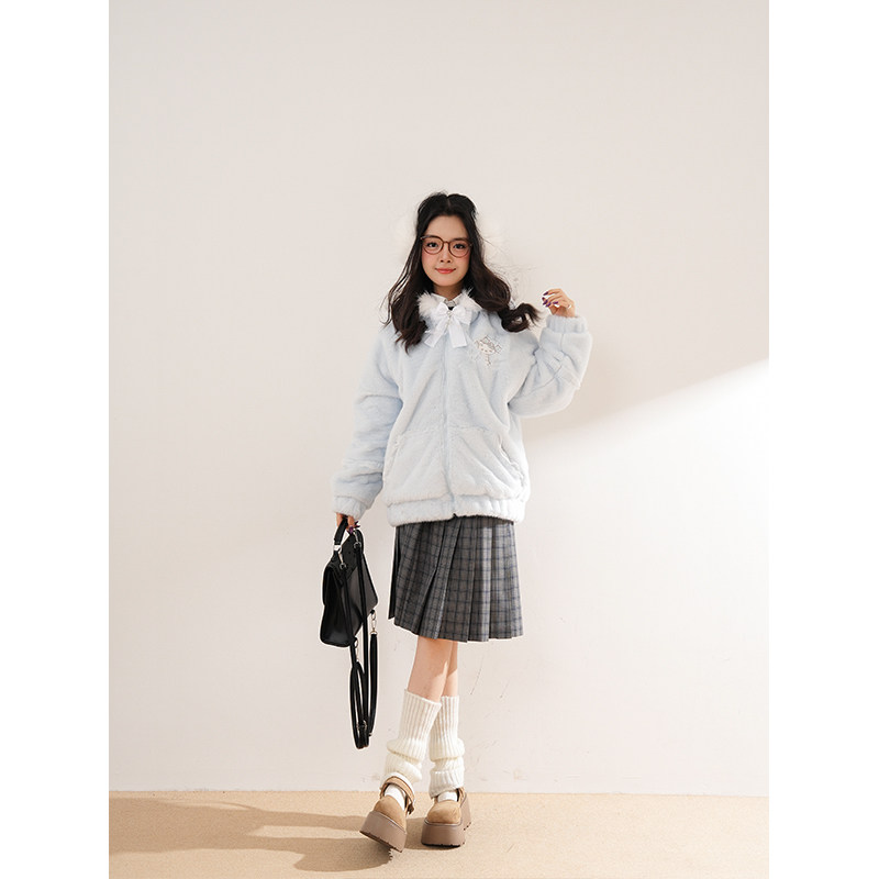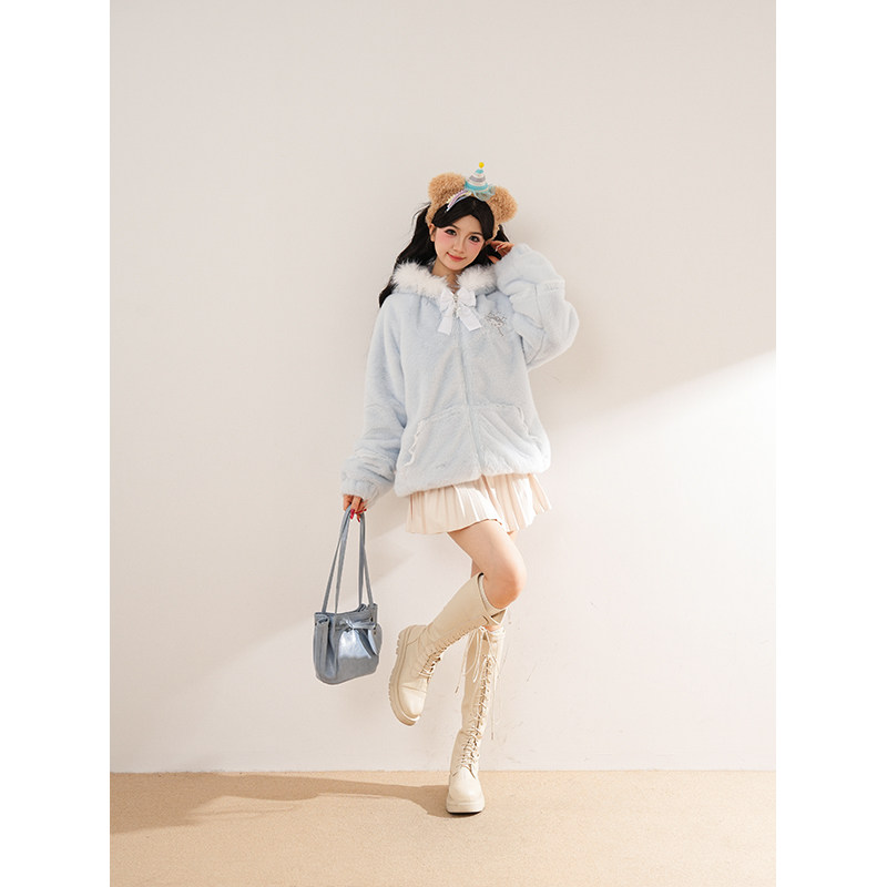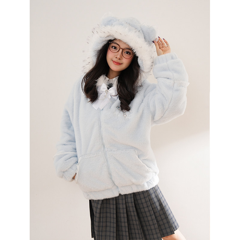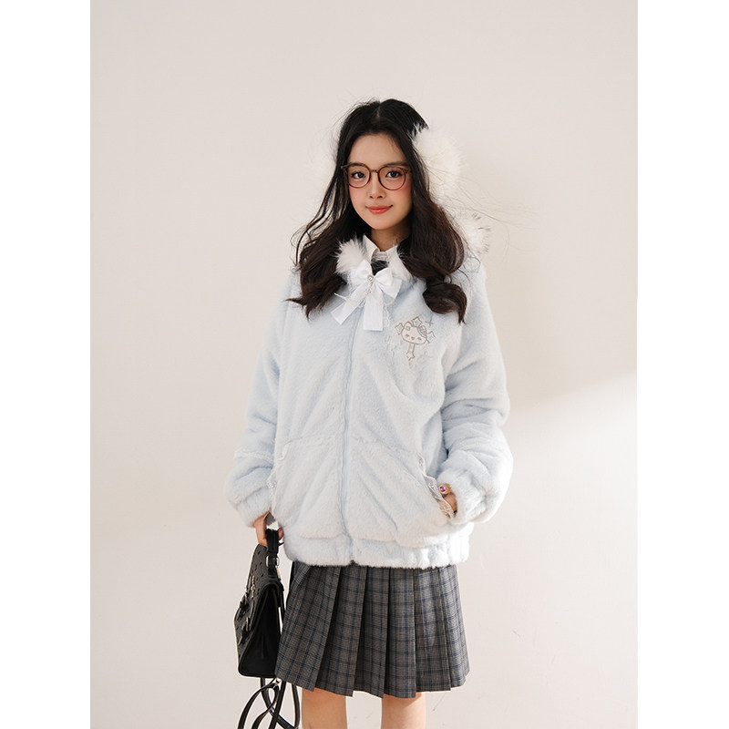 暖冬叙事 冬季新款古早奈奈水色连帽甜酷少女穿搭学院风毛绒外套