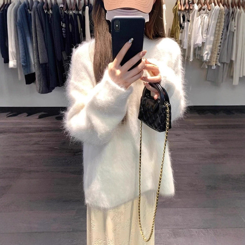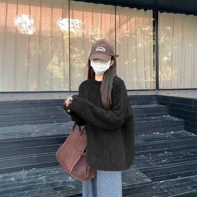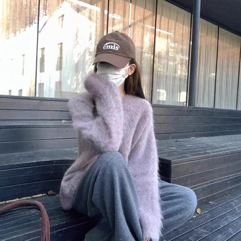 慵懒风软糯灰色仿水貂绒圆领毛衣女秋冬奶fufu宽松内搭针织衫上衣