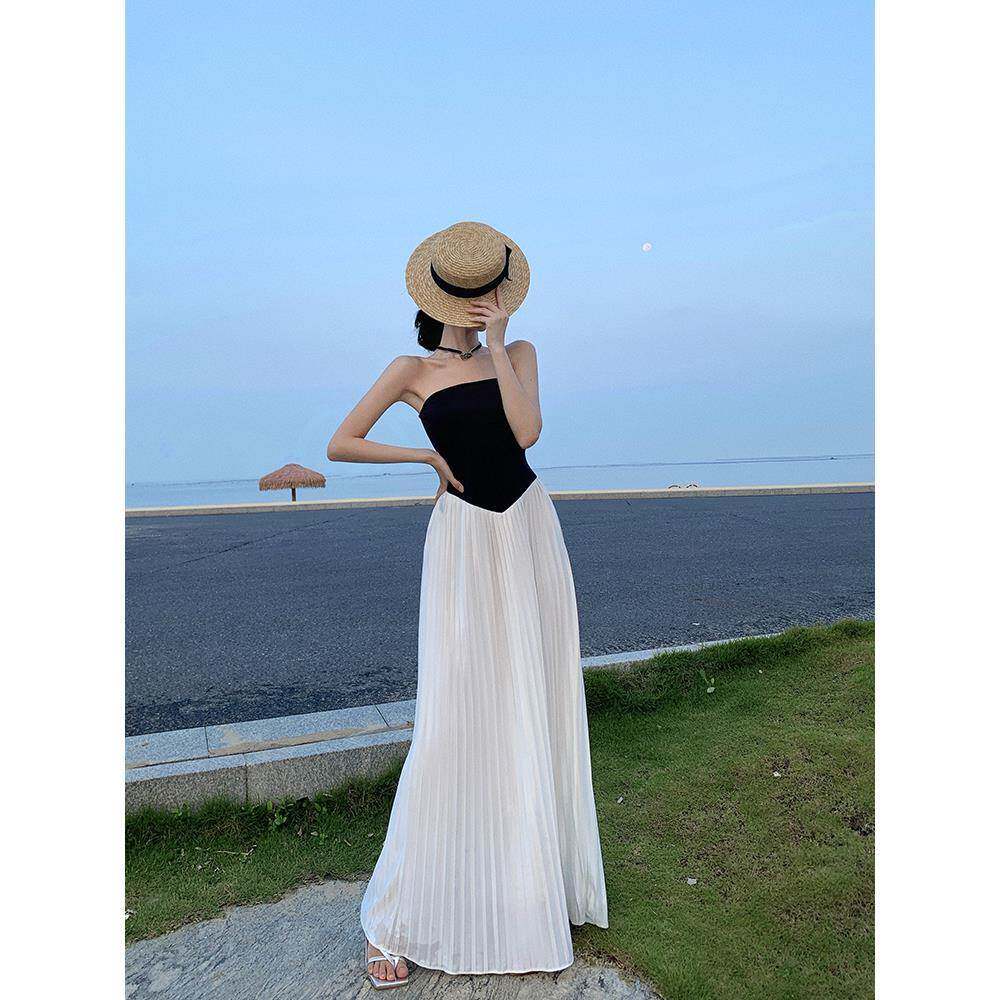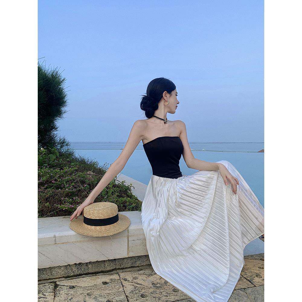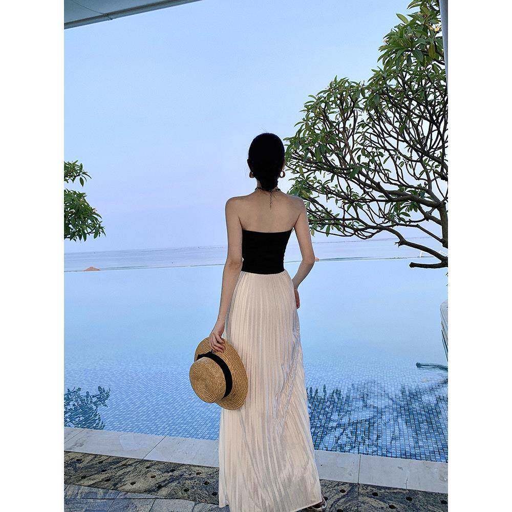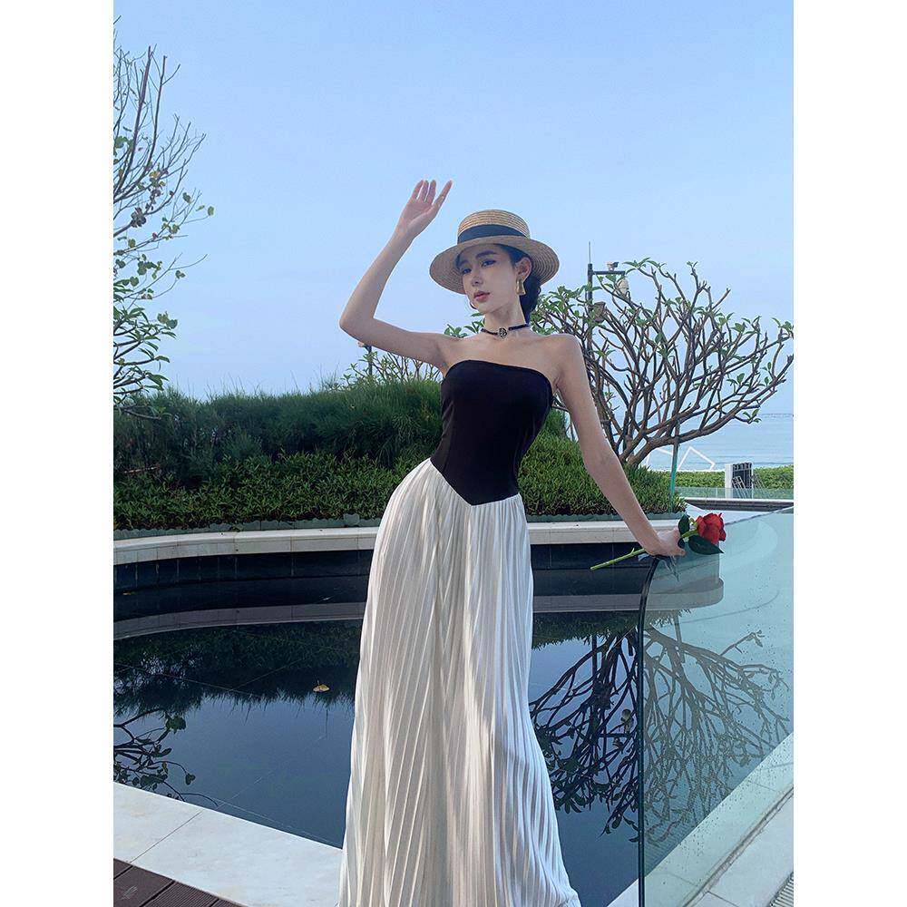 法式海南三亚度假百褶沙滩长裙云南泰国旅游一字肩抹胸露背连衣裙