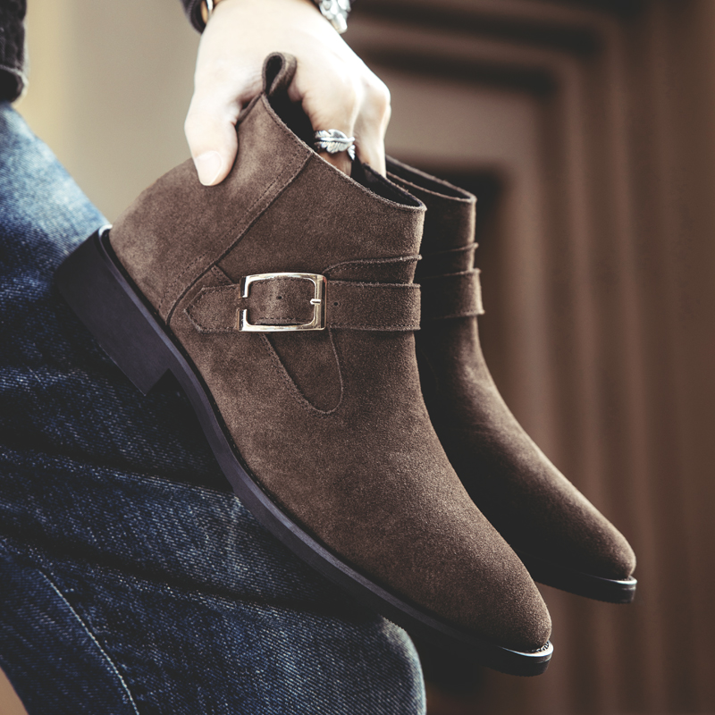 男士中高帮皮鞋套筒牛反绒磨砂皮牛皮英伦百搭皮带扣切尔西短靴子