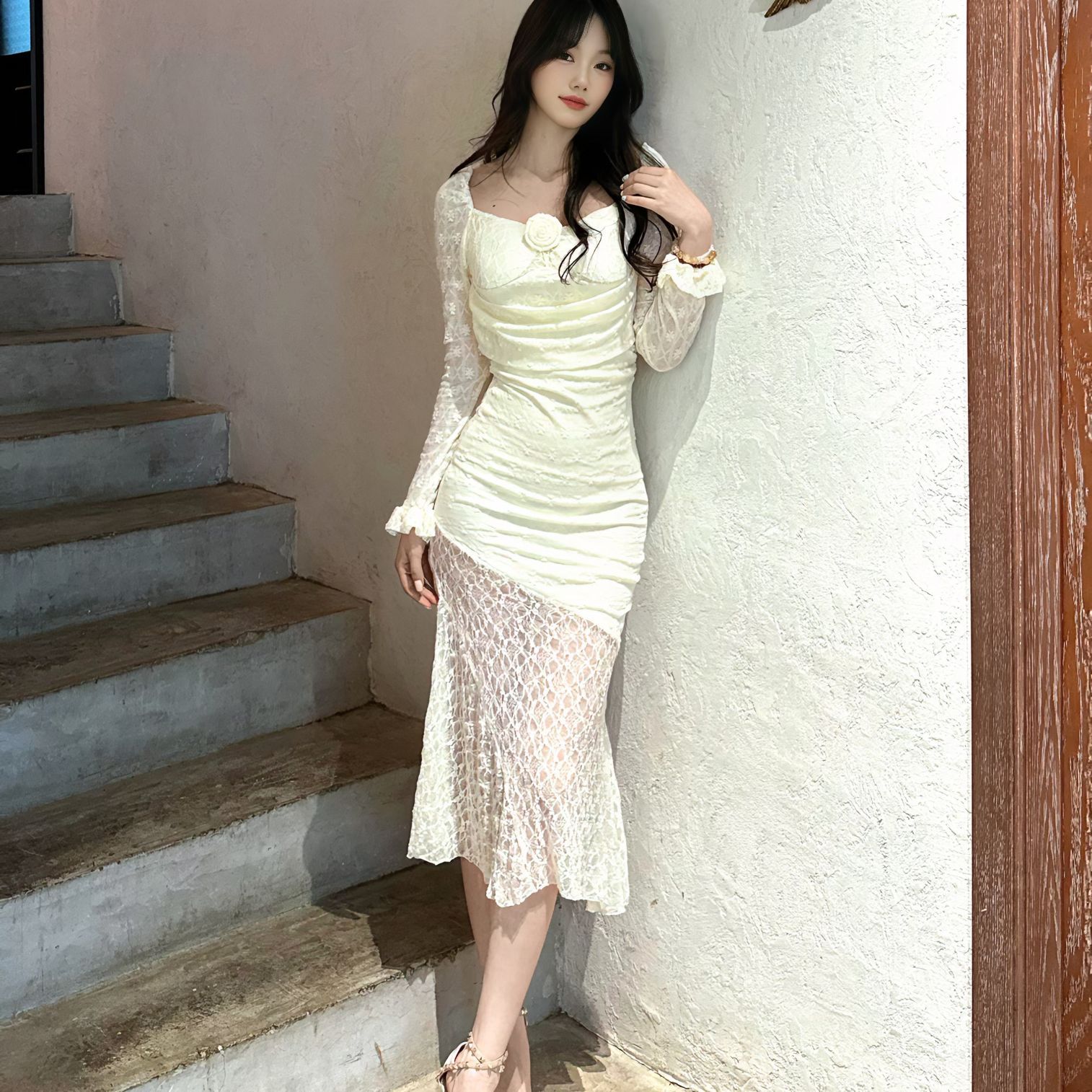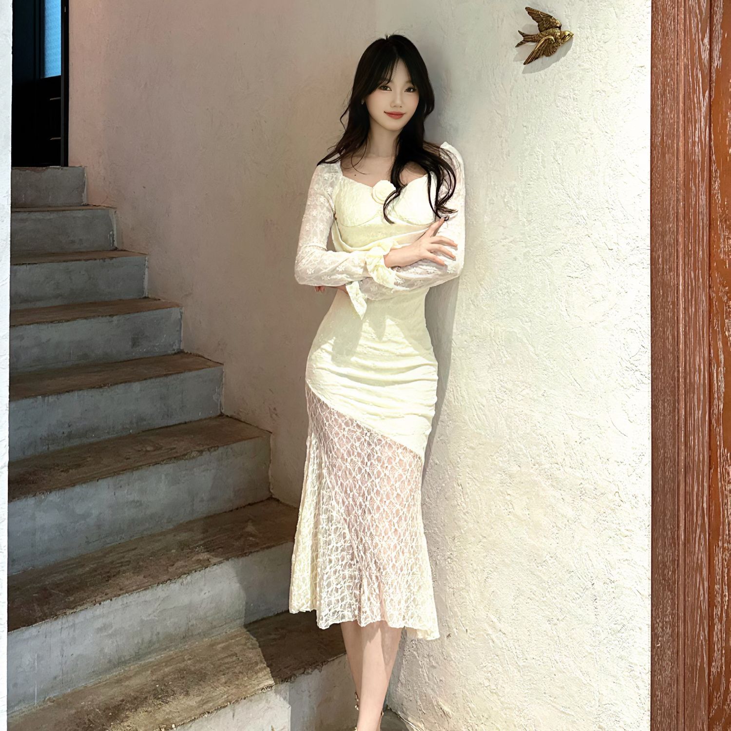 气质方领性感立体花朵蕾丝连衣裙长袖修身纯欲收腰包长裙鱼尾