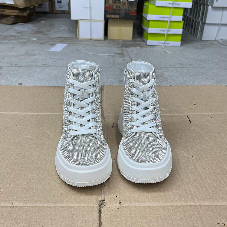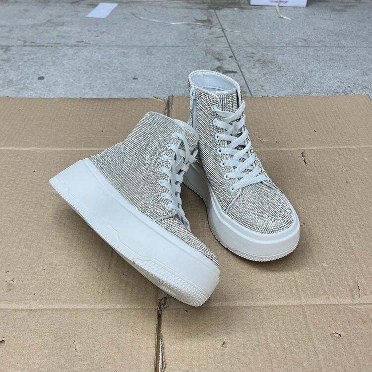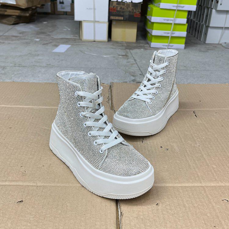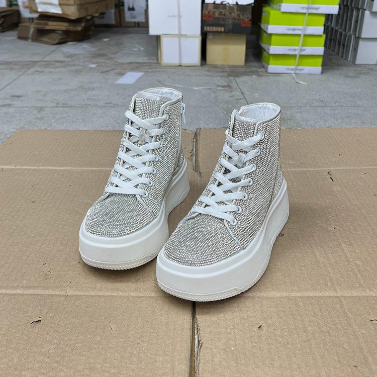 外贸原单女靴新款时尚圆头厚底高帮带钻系带亮闪百搭板鞋学生鞋