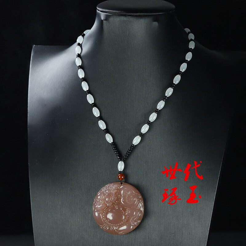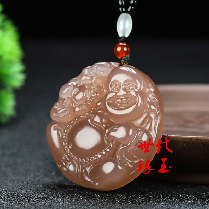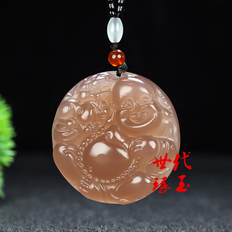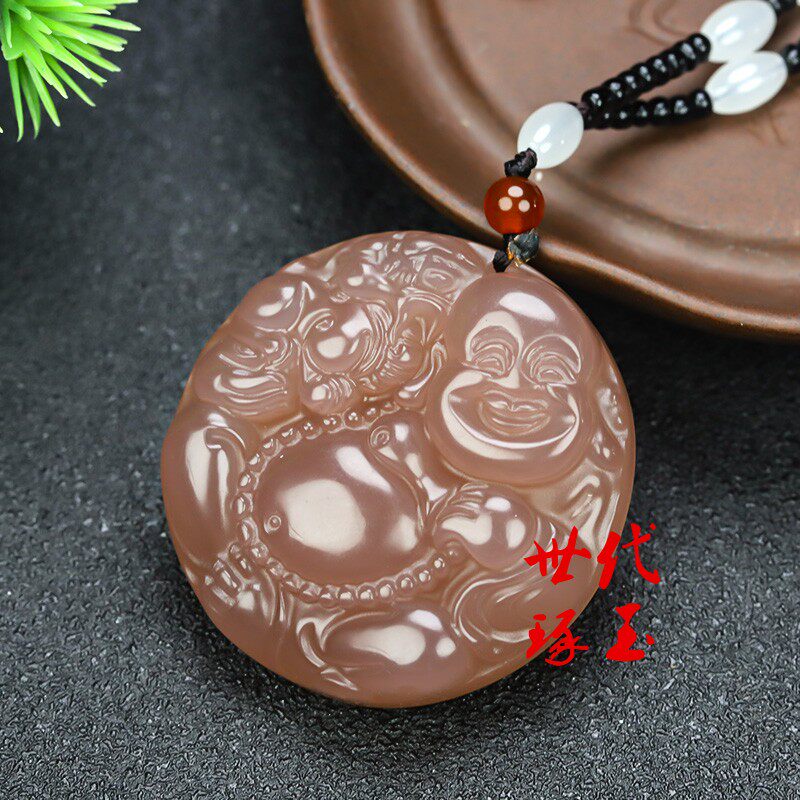 天然和田玉藕粉色弥勒佛吊坠新疆玉烟紫玉佛佛公挂坠挂件笑佛玉佩