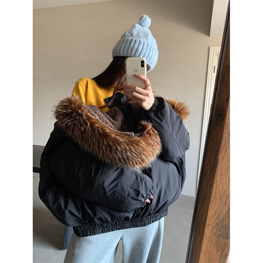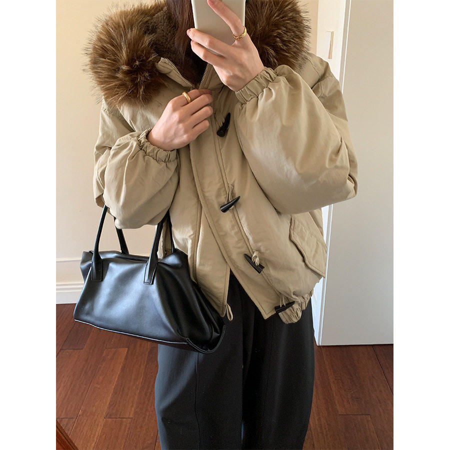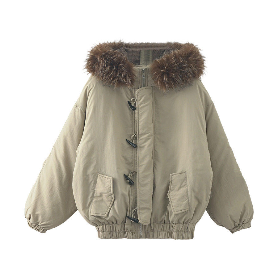 韩系加厚连帽大毛领棉服外套女冬季保暖牛角扣棉袄大衣541137