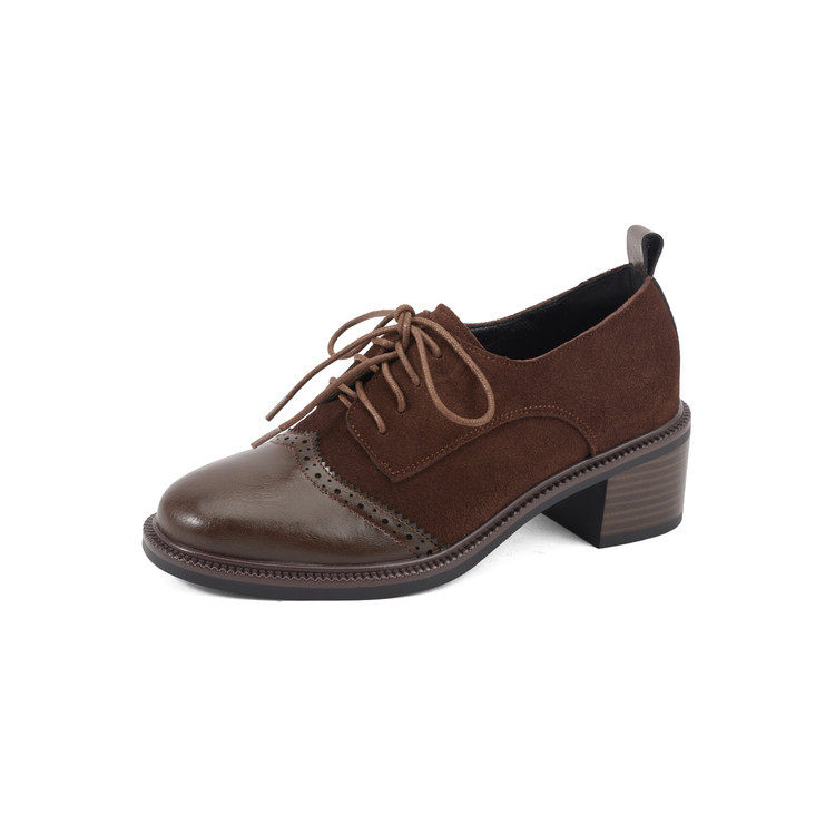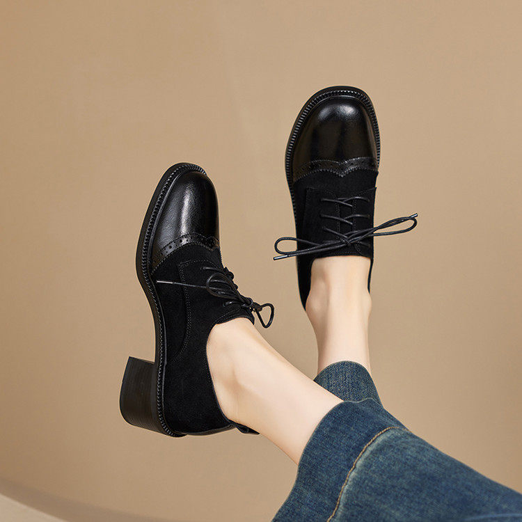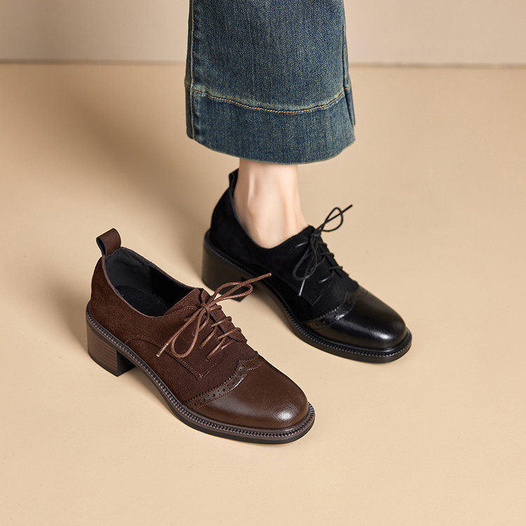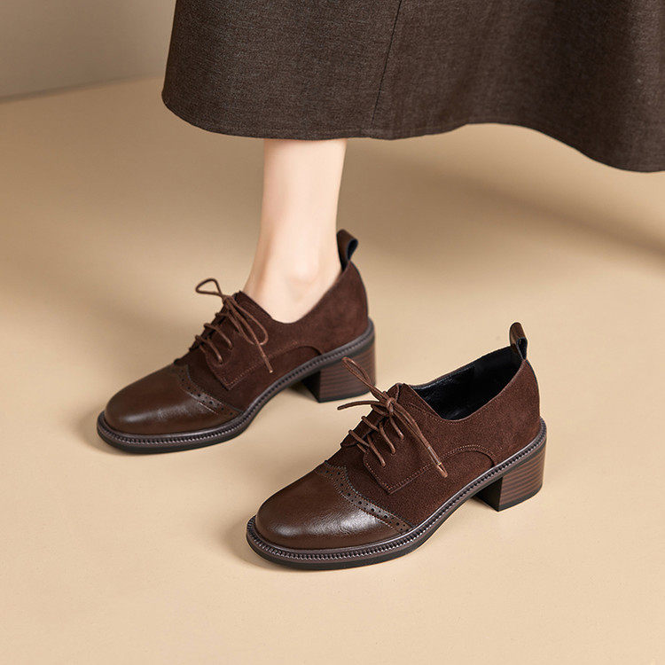复古真皮棕色系带小皮鞋女英伦布洛克鞋粗跟深口单鞋乐福鞋不累脚