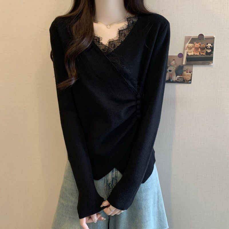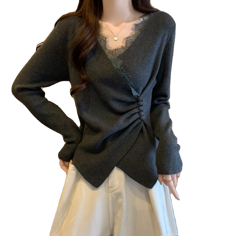 欧货蕾丝V领高级感大尺码女装胖mm秋冬收腰遮肚毛衣内搭针织打底