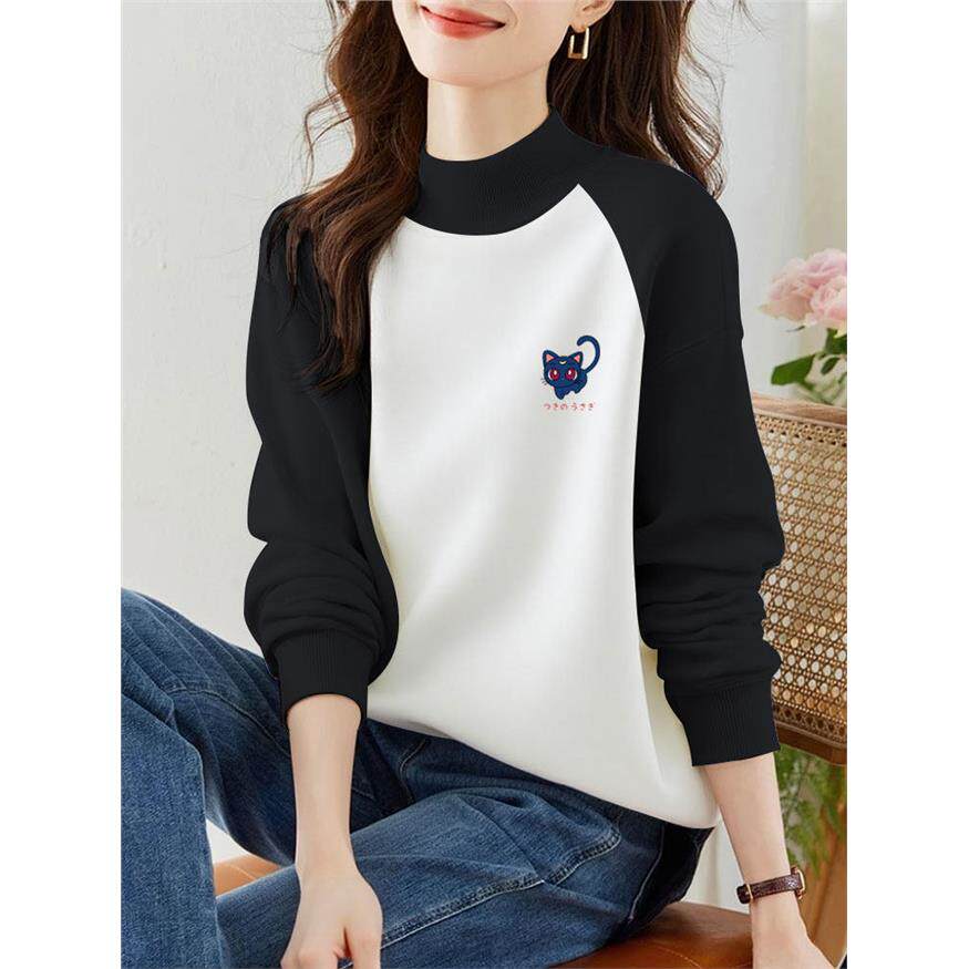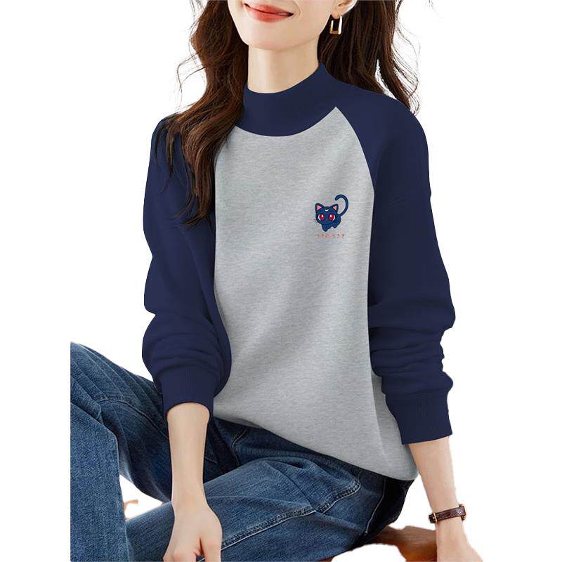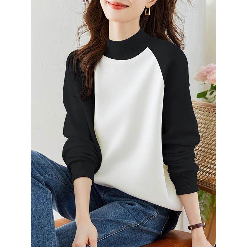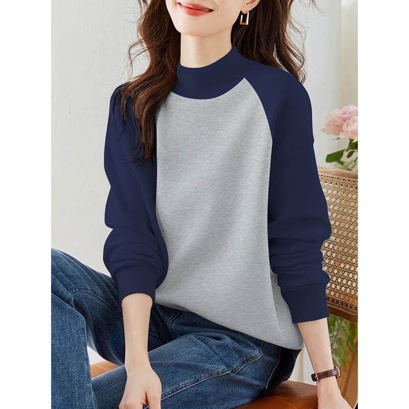2025秋冬半高领加绒加厚卫衣女宽松休闲时尚撞色百搭气质显瘦上衣