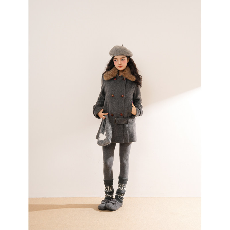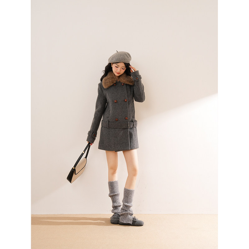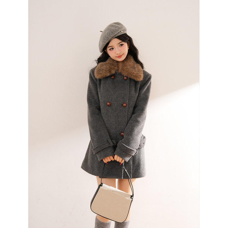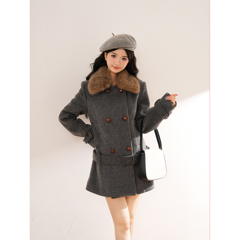 【旧巷拾光】复古高级秋冬毛领双排扣毛呢外套收腰千金呢子大衣女