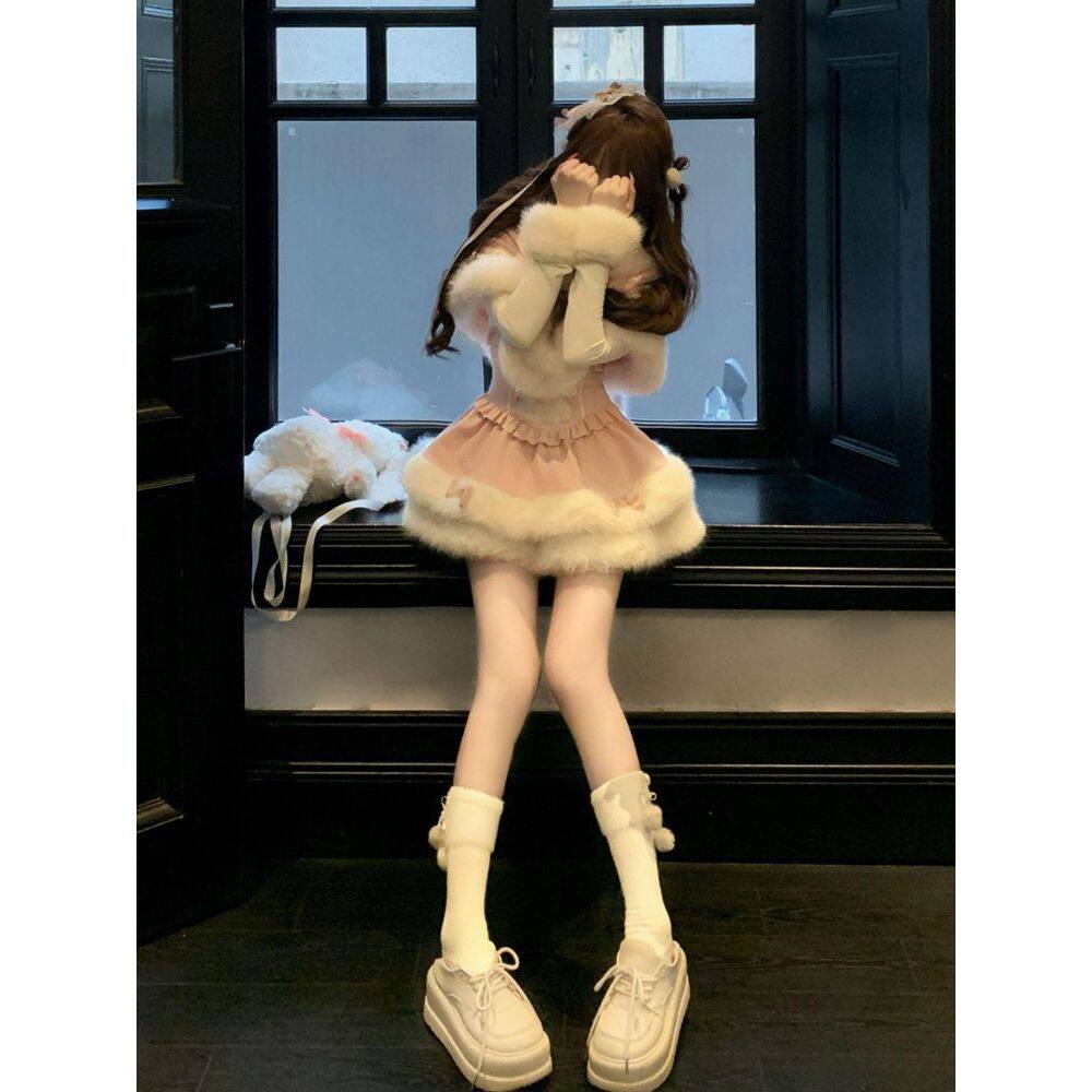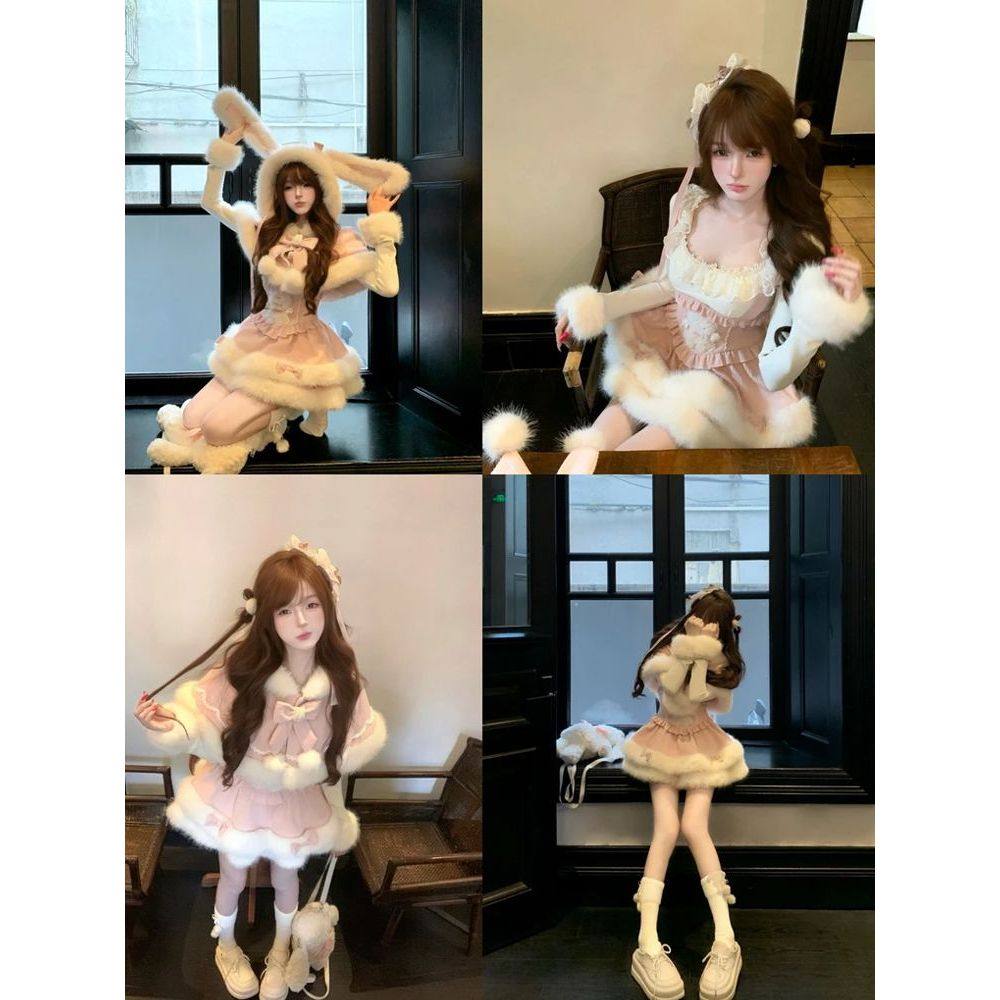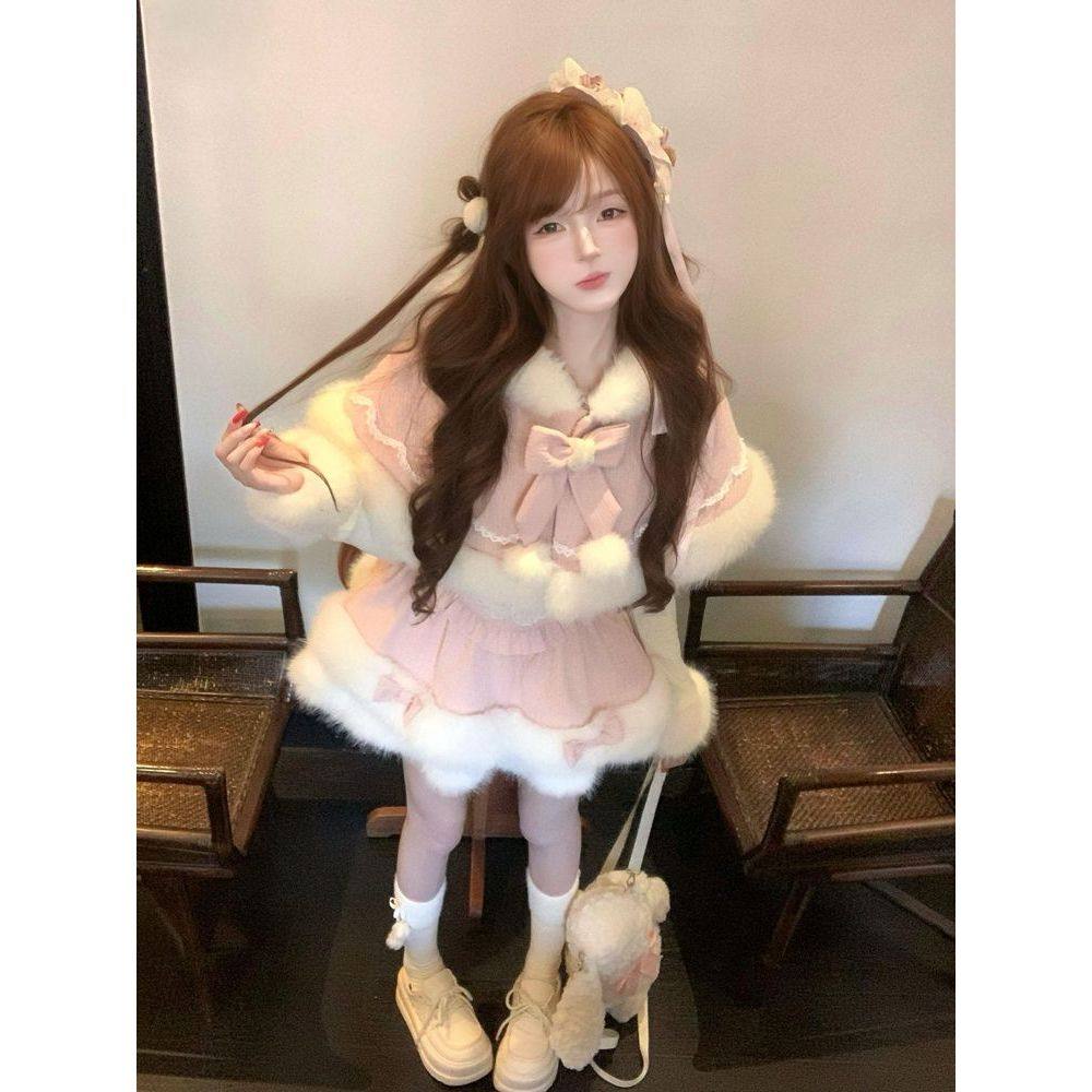 心愿小兔 冬季甜美可爱萌妹风时尚套装斗篷新年战袍连衣裙三件套