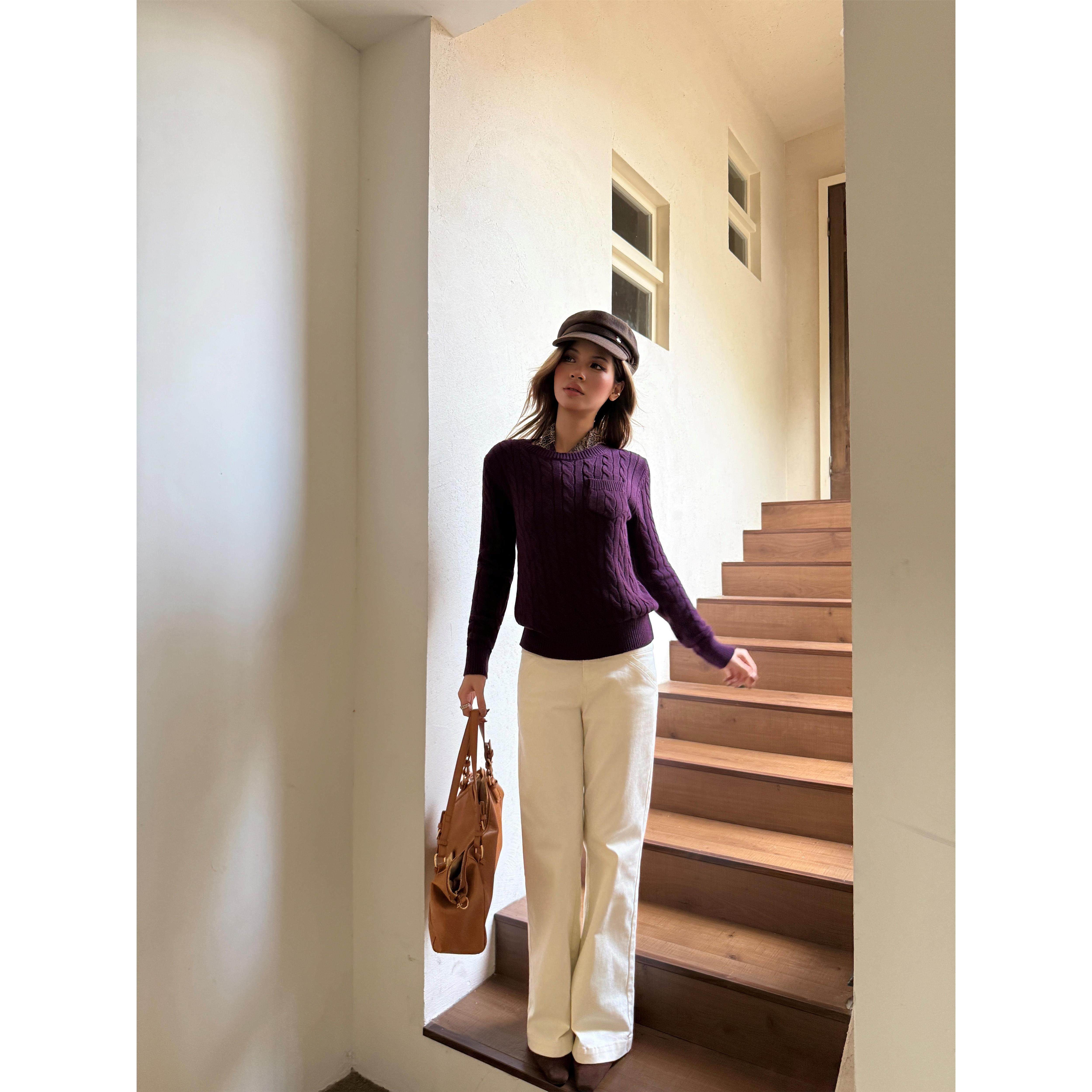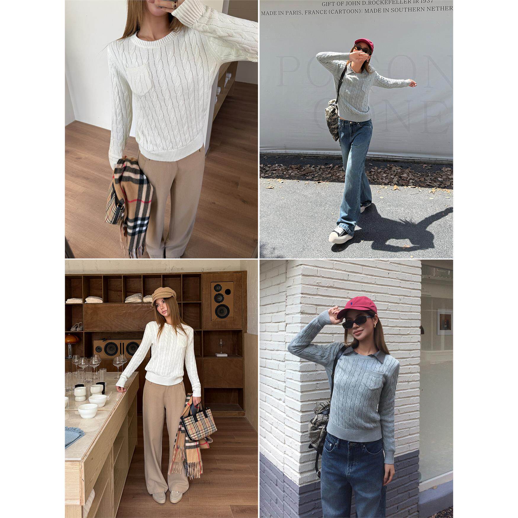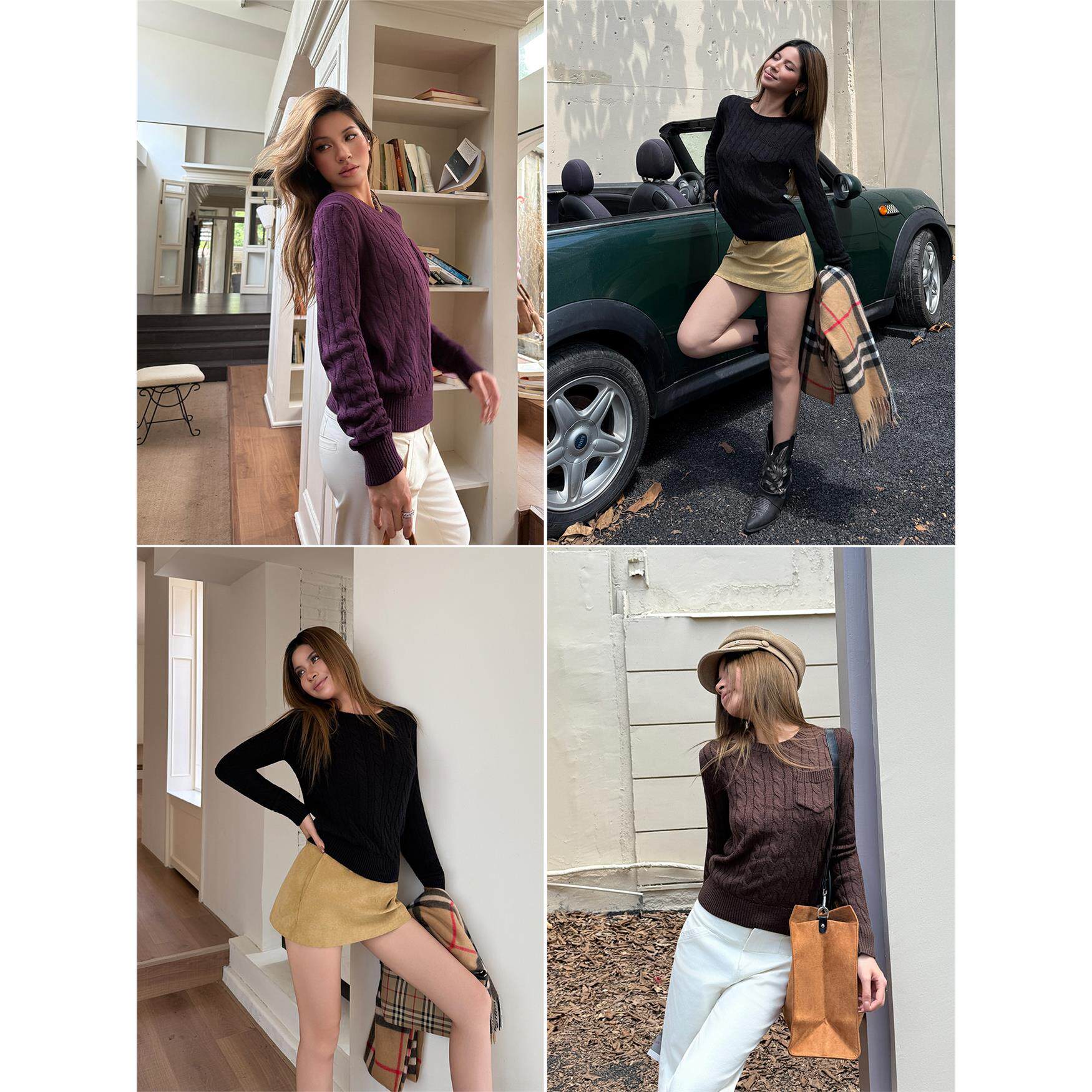 Audwyn圆领麻花毛衣修身针织衫女初秋新款直筒百搭气质长袖上衣
