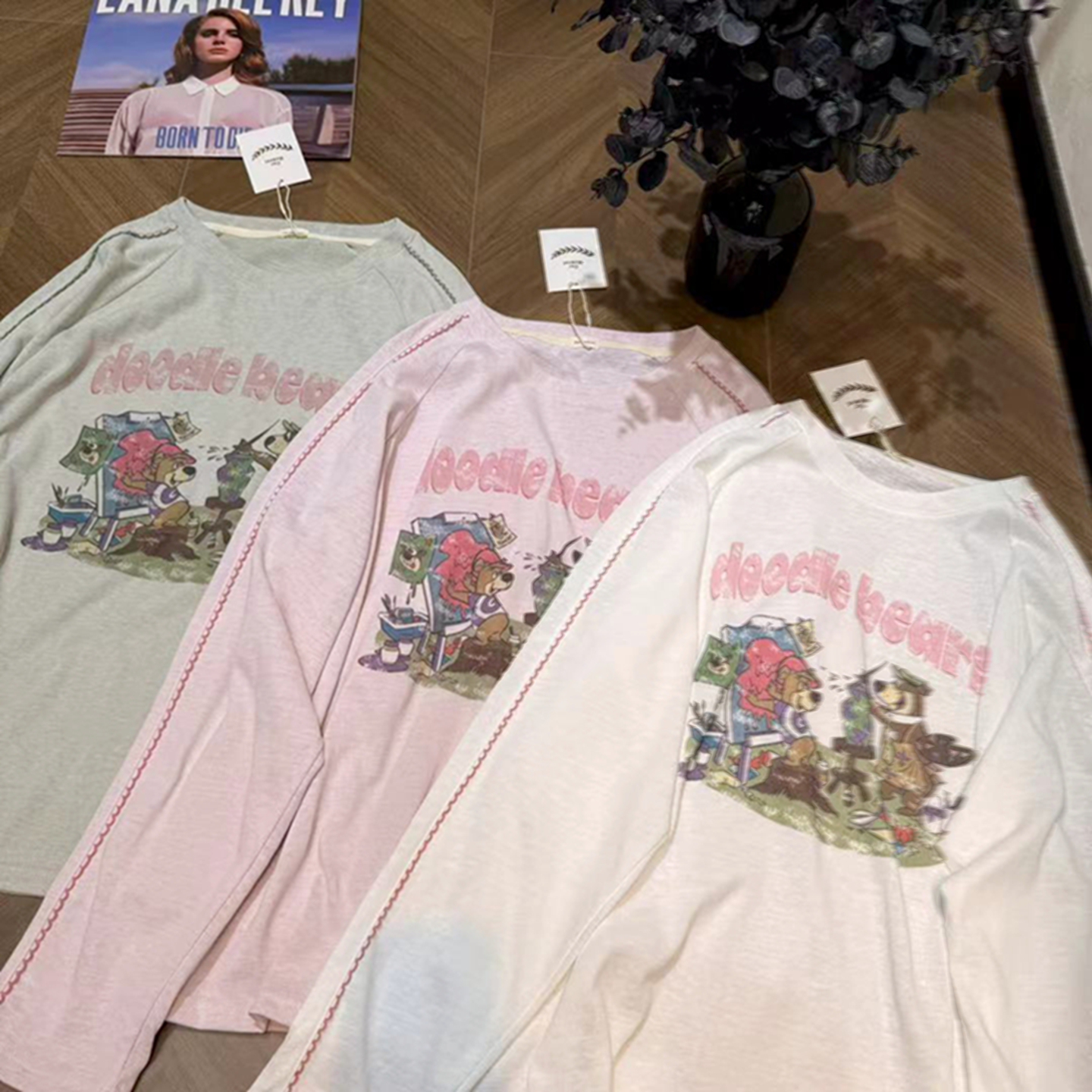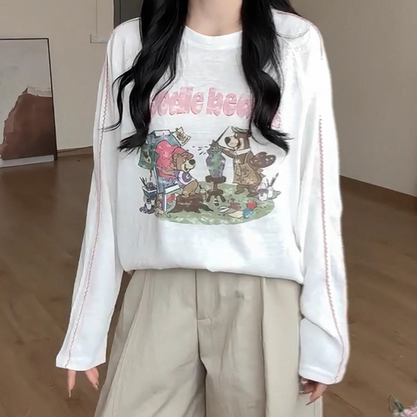 秋季新款简约韩系插肩袖宽松版上衣动物印花小熊长袖T恤