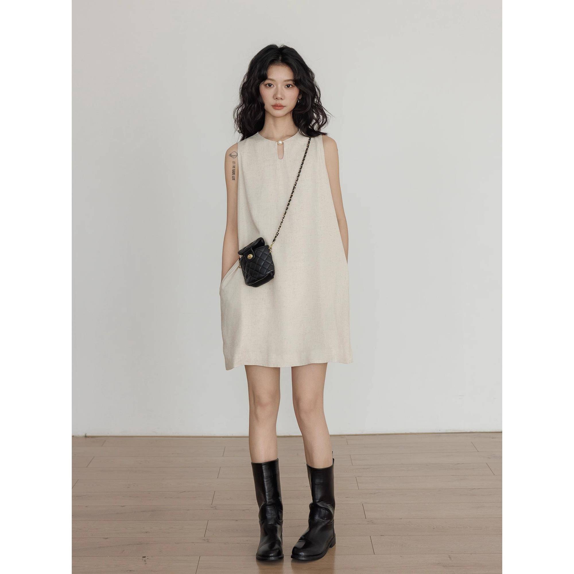 夏季慵懒度假风无袖背心连衣裙女2025新款松弛感侘寂风宽松短裙