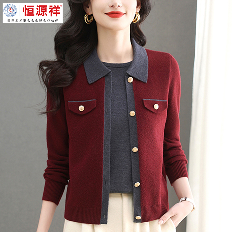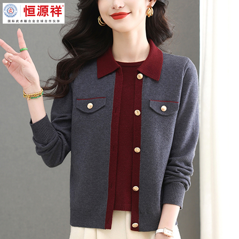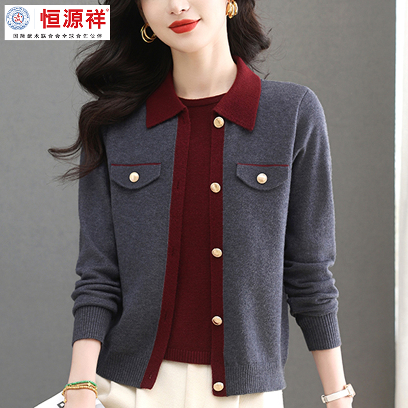 恒源祥彩羊2025秋季新款翻领拼色上衣设计感假两件单穿开春毛衣