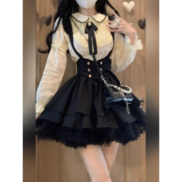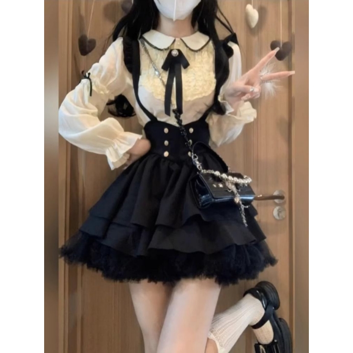 大码学院风收腰背带蝴蝶结背带裙女秋冬纯欲甜美娃娃领衬衫两件套