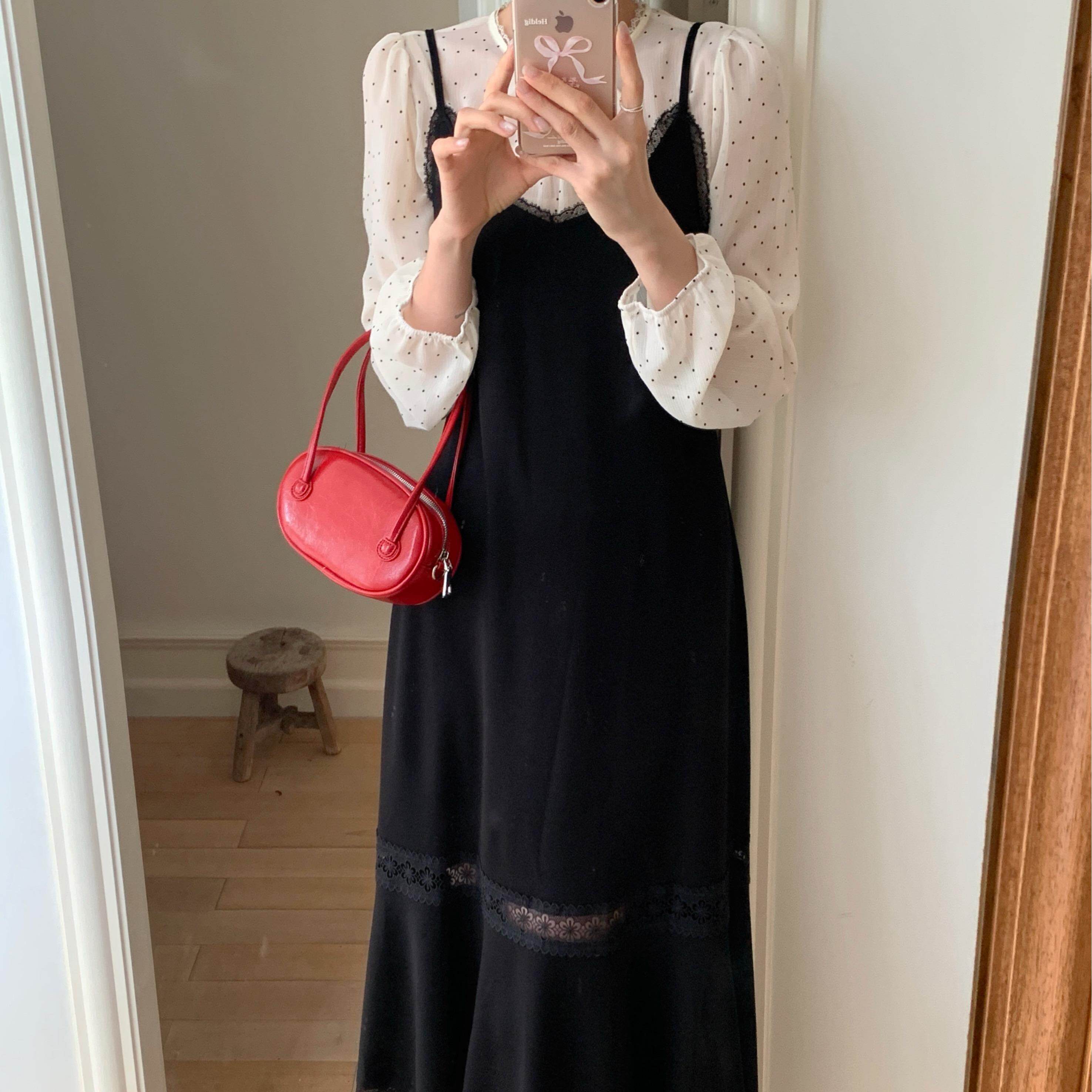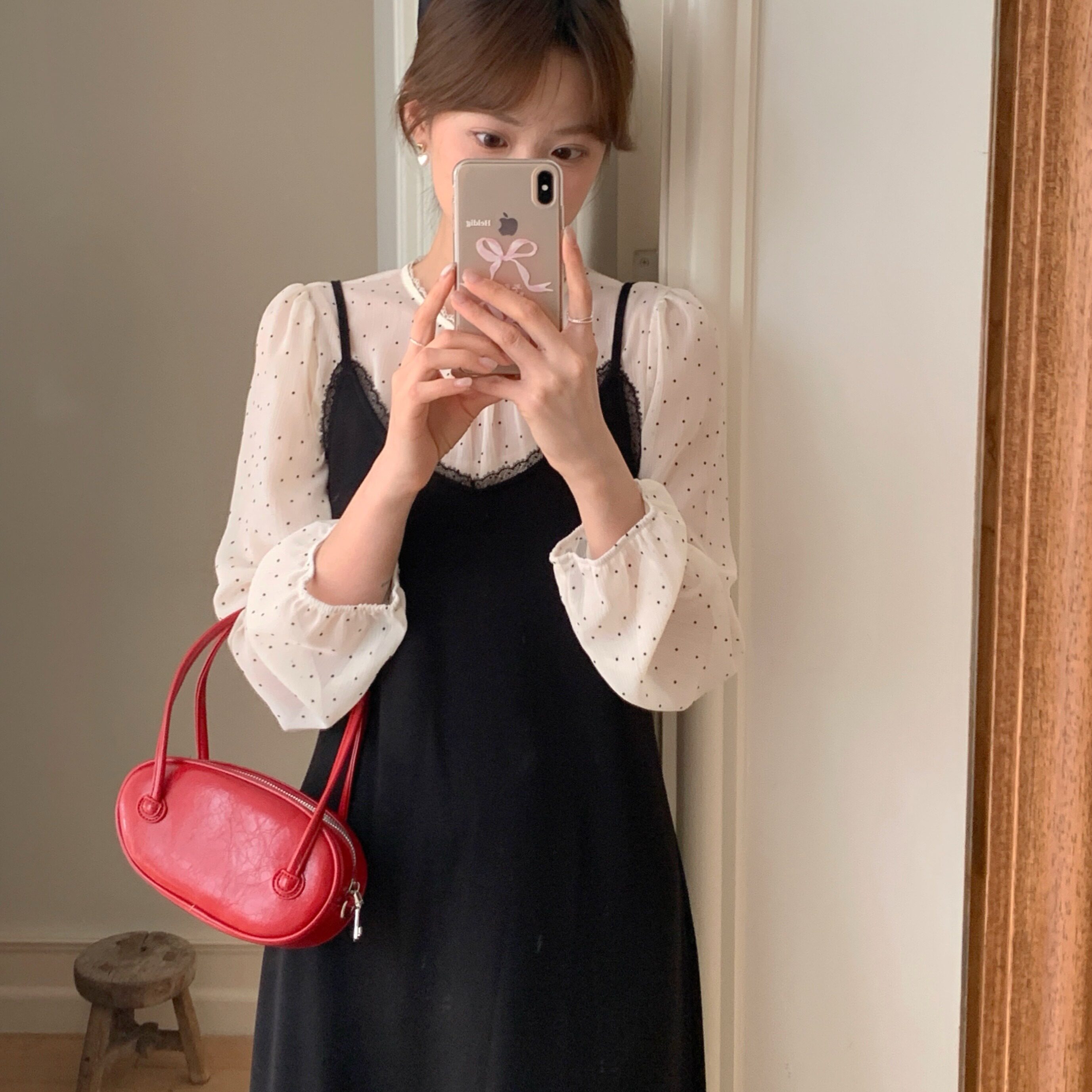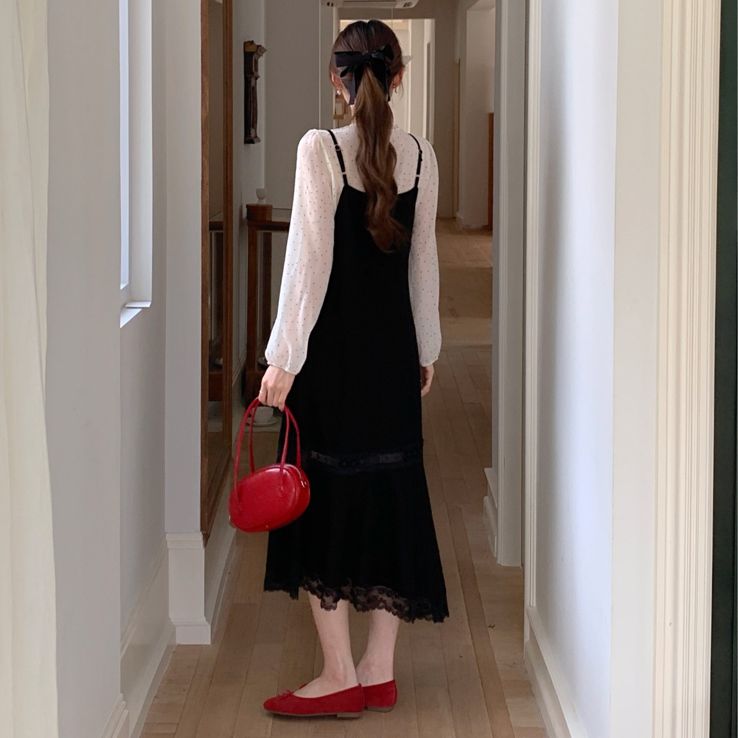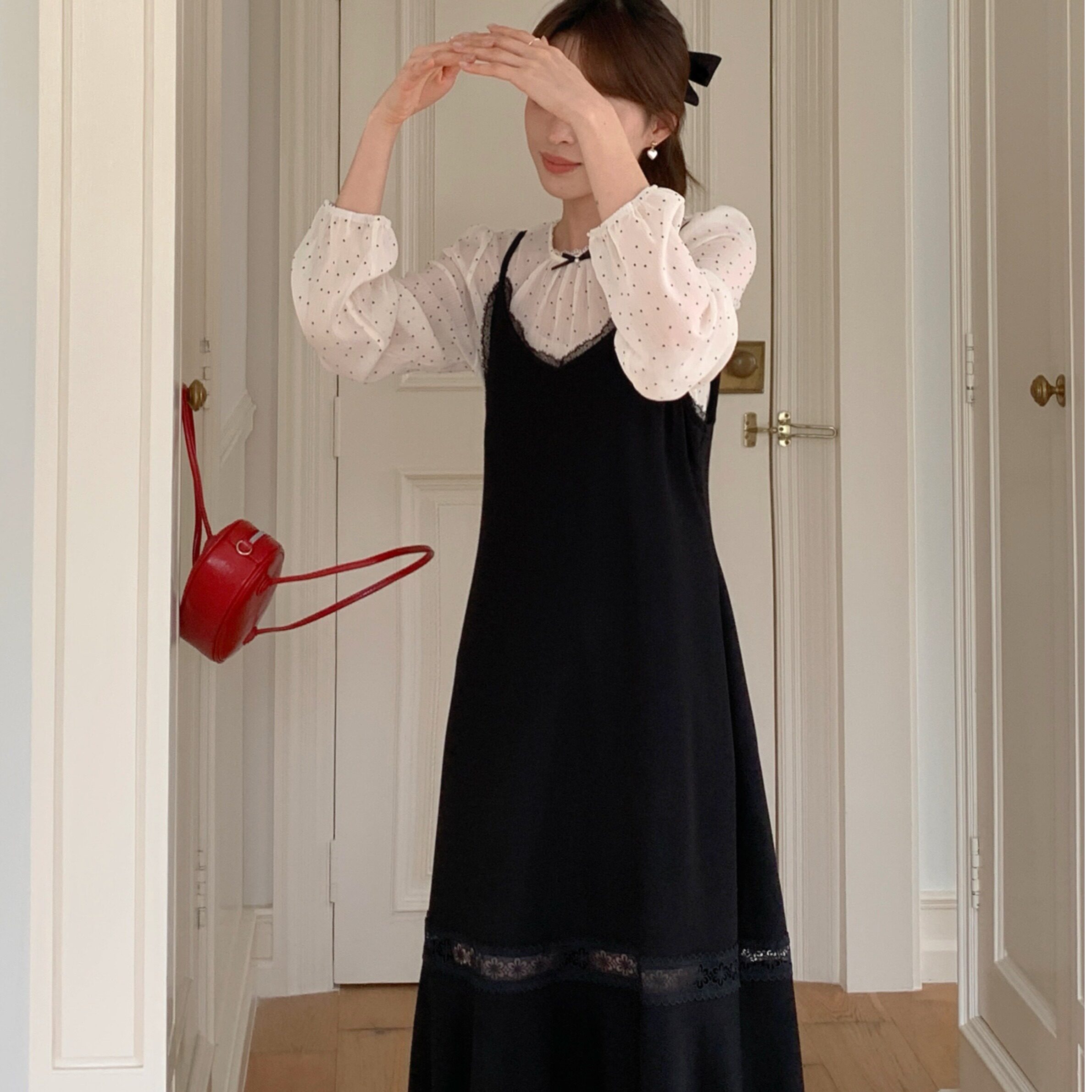 糖果儿大码韩版百搭减龄波点衬衫V领拼接蕾丝花边连衣裙时尚套装