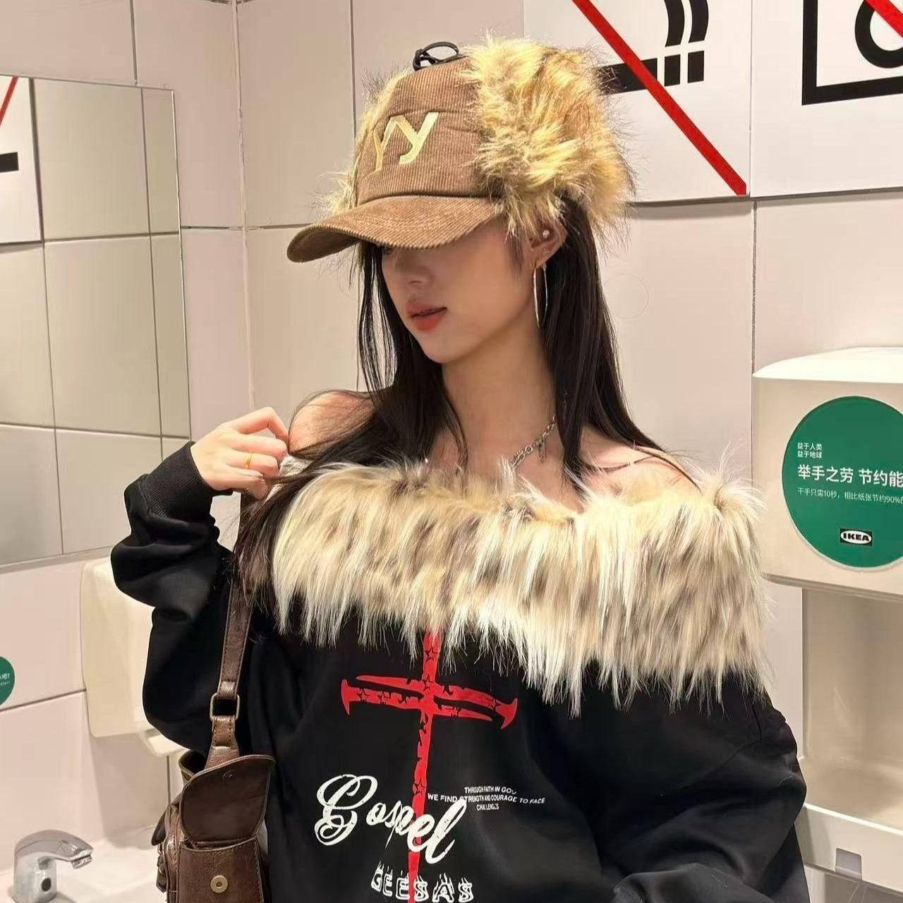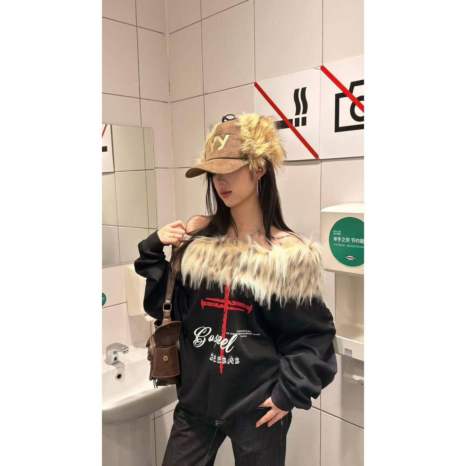 云朵绒复合黑色宽松设计百搭长袖毛领可拆卸十字架印花卫衣女