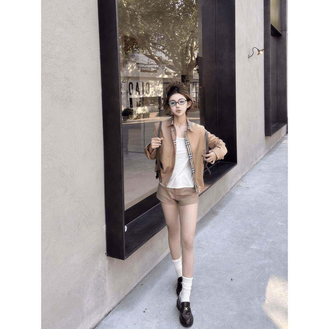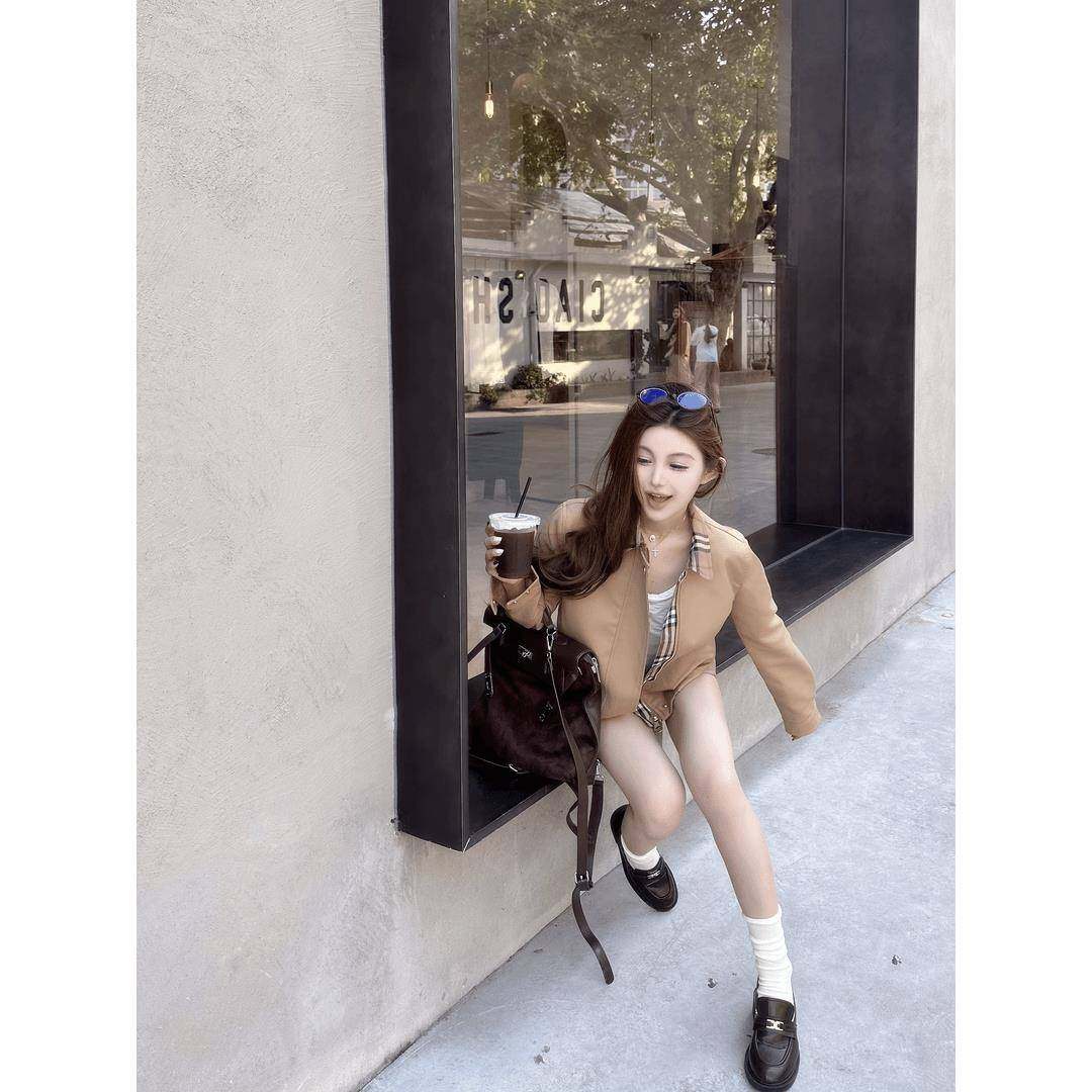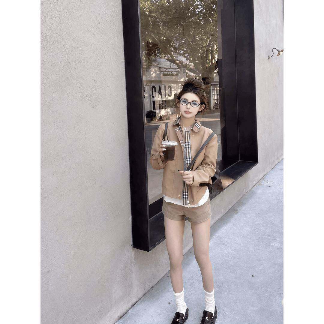 2025春秋新款东京日落卡其色格子风衣夹克外套女短款法式气质上衣