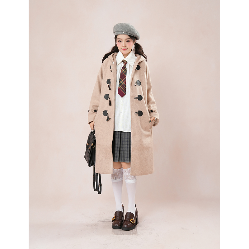 2025冬季连帽牛角扣毛呢外套女英伦风韩版宽松过膝加厚中长款大衣