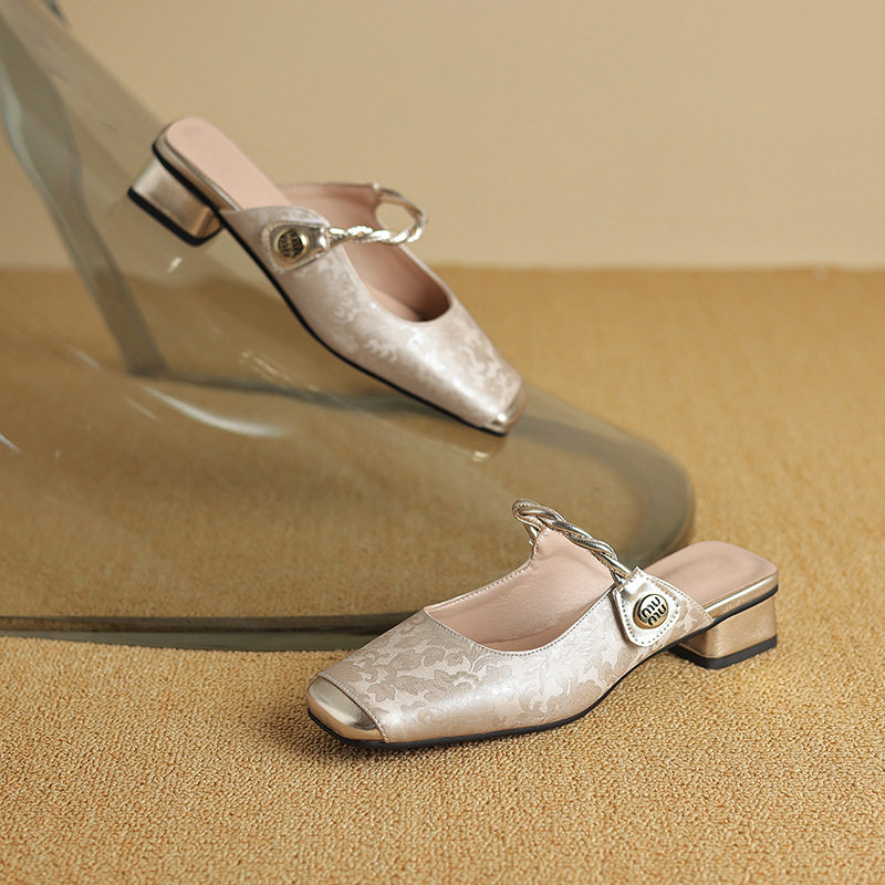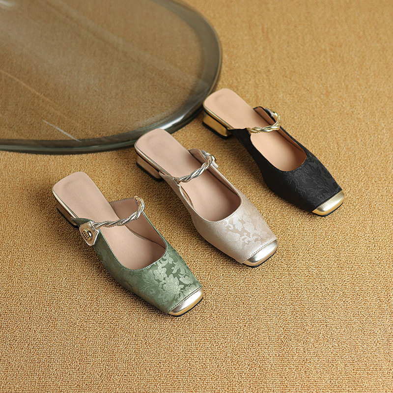 2024夏季新款新中式国风拼接方跟中跟包头半拖女舒适百搭旗袍裙子